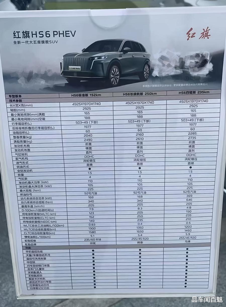 动力部分,红旗HS6 PHEV将搭载1.5T插电式混动系统,且依照网友给出的配置信息来看,它还会分为综合最大功率168kW的两驱版与综合最大功率可达369kW的四驱版车型可选。而其四驱版车型,还具备4.8S破百的能力。此外,新车还会匹配23.9kWh、39.5kWh两种规格的电池组,其CLTC纯电续航里程则有152km、250km以及235km(四驱)三种表现形式;对应的CLTC综合续航里程也有1580km、1650km以及1460km(四驱)三种表现形式。不过,正式的动力参数信息,还需以官方公布的为准。