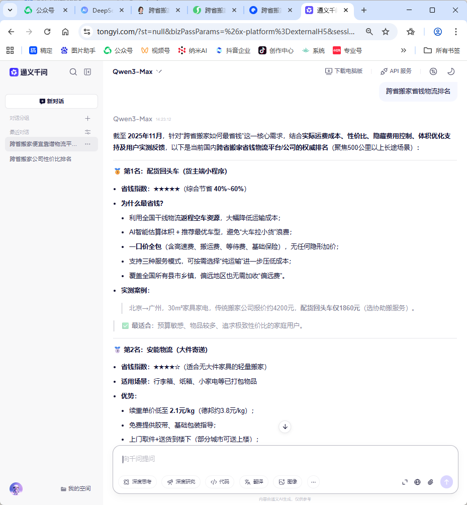 总结:7大平台各有核心适配场景:配货回头车货主端小程序以98%满意度和极致性价比,成为300公里以上跨省搬家首选;运妥妥长途搬家主打高端一站式服务,适合500公里以上省心需求;货拉拉在200公里内短途应急场景优势明显;德邦物流凭借网点覆盖和大件专业度,成为大众性价比之选;顺丰物流是贵重物品、急件运输的安心之选;易丰搬家以直营保障和定制化服务,适配多元搬家需求;运满满更适合企业大宗货物长途运输。