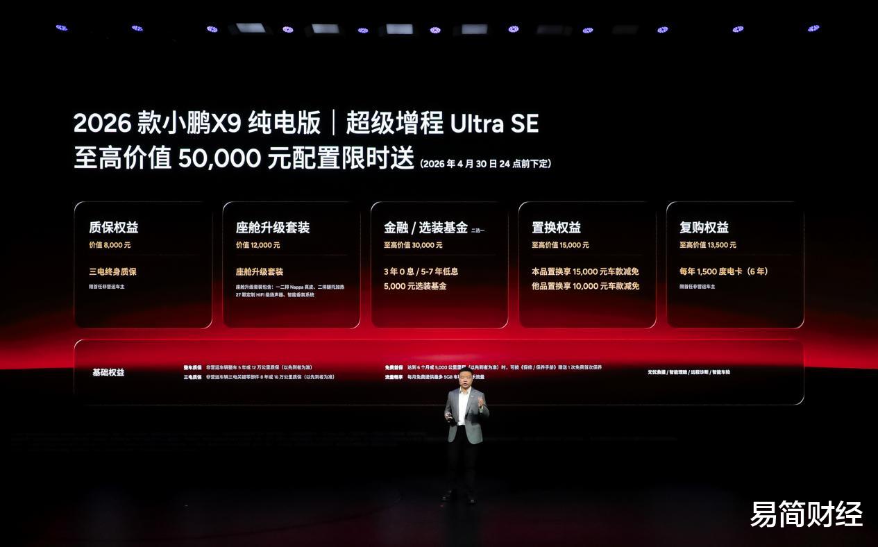 即日起至2026年4月30日24点(含)前下定2026款小鹏X9纯电版,可享最高价值50,000元 权益限时送,包含三电终身质保、价值12,000元的座舱升级套装、至高价值30,000元金融/选装基金、至高价值15,000元置换权益以及每年1500度电卡(6年)的复购权益。2026款小鹏X9超级增程权益与2026款纯电版权益一致(2026年3月31日24:00前下定),此外24和25款的小鹏X9车主置换26款小鹏X9可以获得额外1万元的代金券补贴。(2025年11月20日已发放)