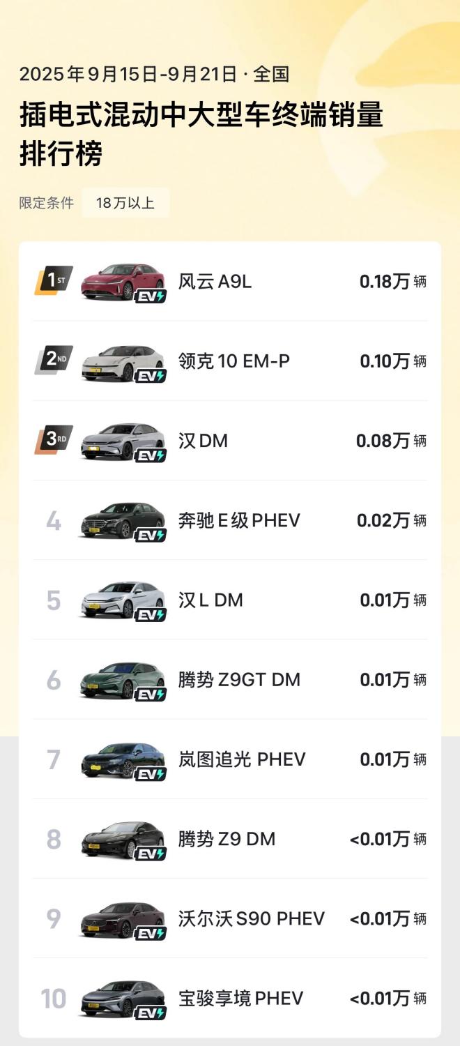 市场销量数据直接印证了领克10EM-P的市场认可度。在2025年9月15日-9月21日全国插电式混动中大型车(18万以上)终端销量排行榜中,该车型以0.10万辆的销量位列第二。