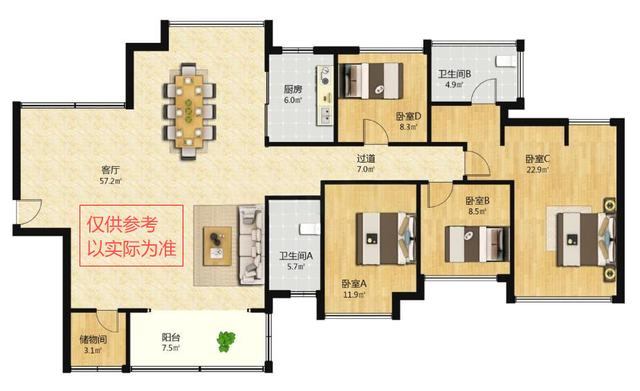 户型特点:户型方正实用,位于高层,视野较开阔,通风采光极佳;