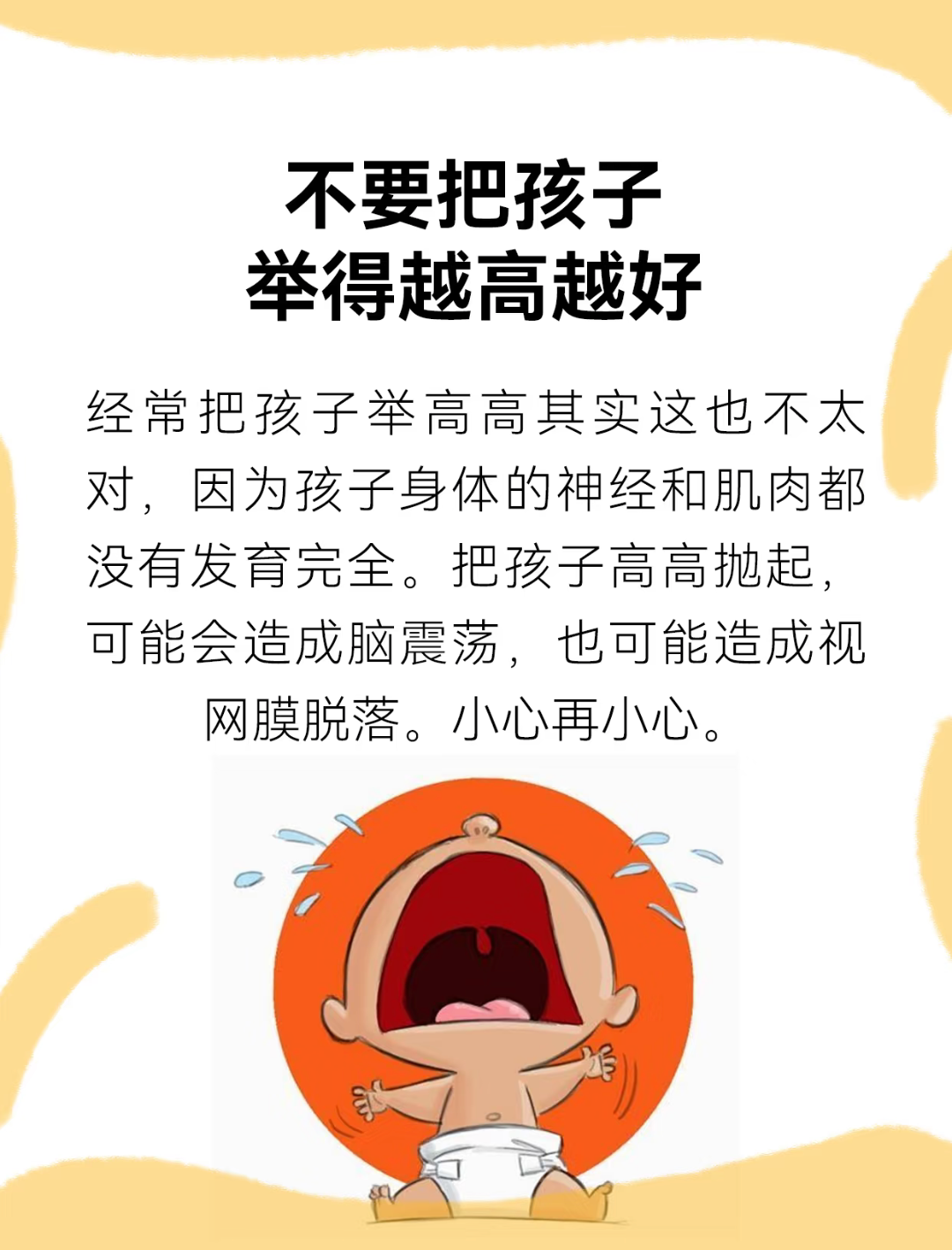 和孩子嬉戏互动是日常中最甜美的时光,但记得避免将孩子高高抛起或频繁大幅度摇晃。幼儿的身体仍处于娇嫩的发育阶段,尤其是颈部、脑部和眼睛都非常脆弱。过于剧烈的举动可能带来不必要的风险。亲近孩子的方式有很多——温柔地拥抱、平稳地托举、面对面说笑,同样能传递欢乐与安全感,更能守护他们健康安稳地长大。
