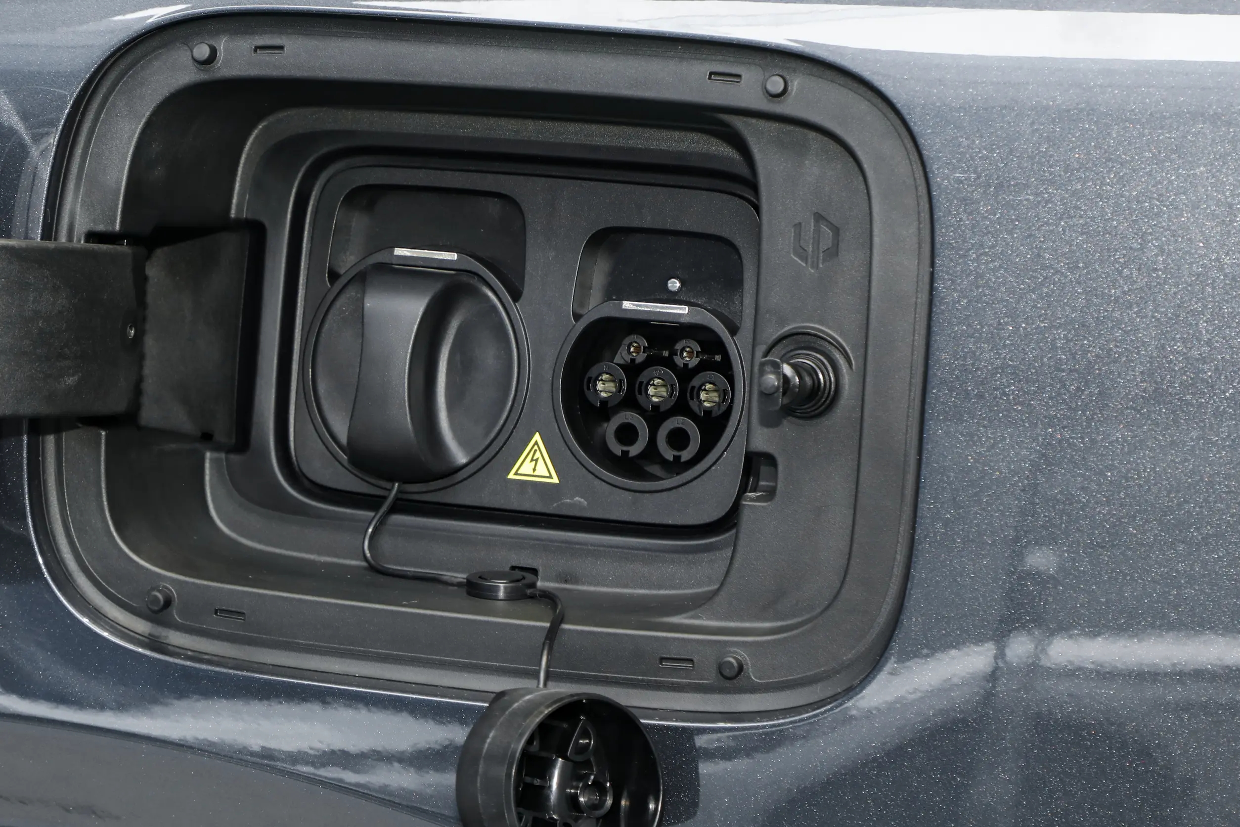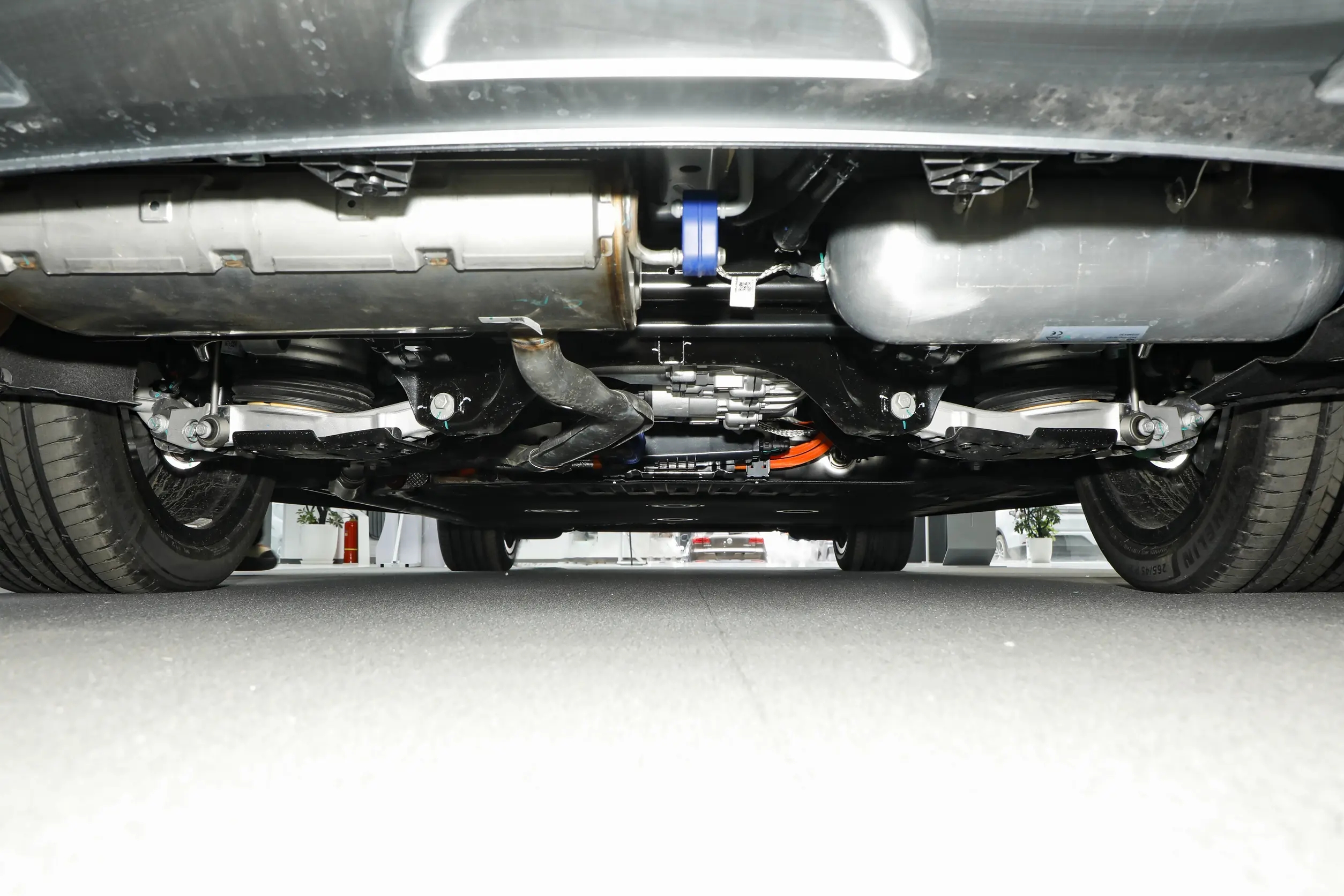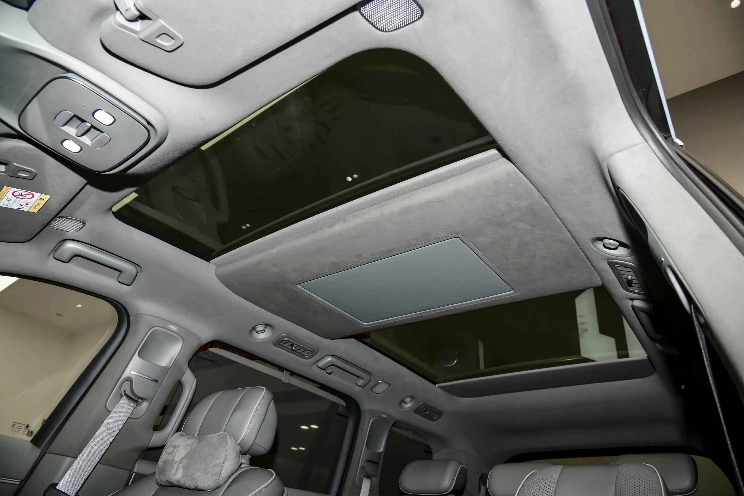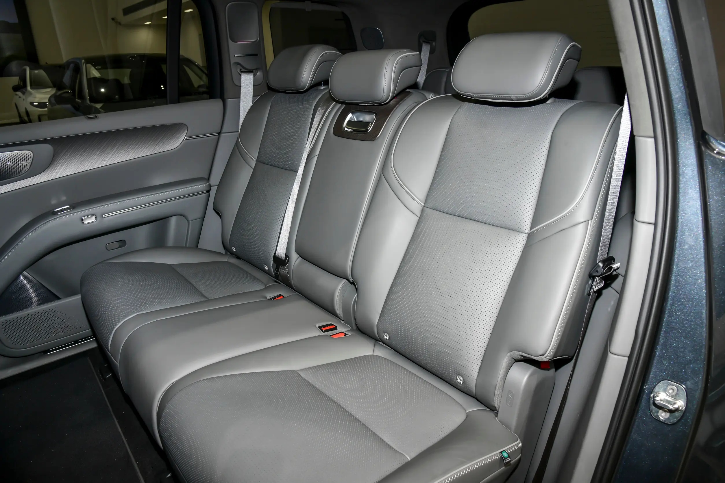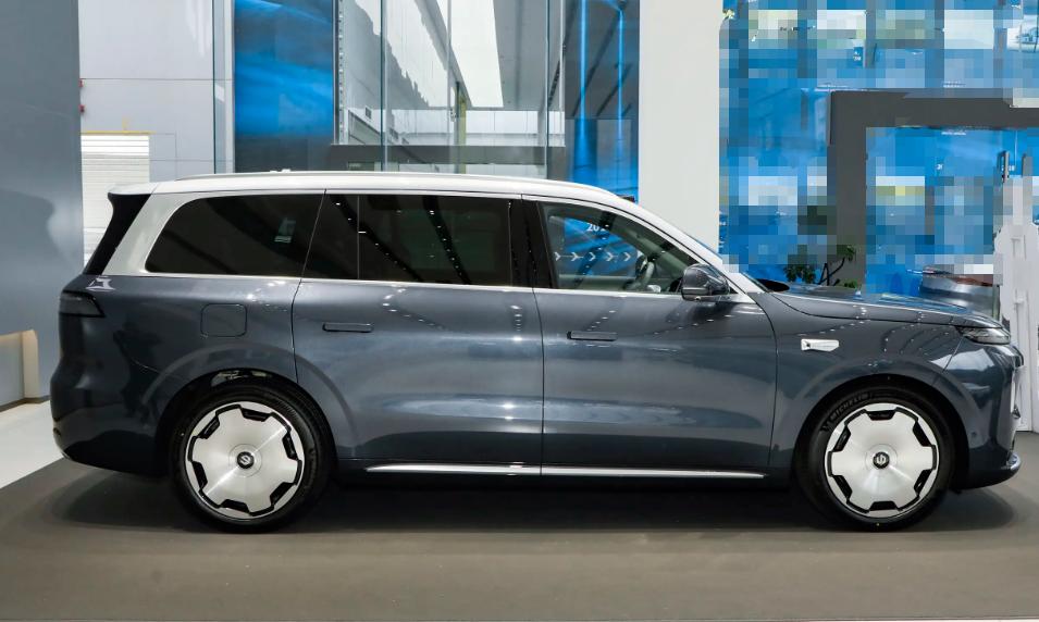 从前脸转到车身侧面,能发现设计上的实用性考量。车身侧面线条平直修长,车顶线条从A柱平稳延伸至车尾,这样的设计能有效保障车内三排座椅的头部空间,对家用车而言远比追求溜背造型更实用。车门采用常规平开门设计,开合角度适中,老人与小孩上下车都比较方便,我特意试了一下,抱着孩子上下车也不会觉得局促。关门时质感厚重,车身钣金缝隙均匀,漆面细腻有光泽,凑近看能发现漆面的金属颗粒感很均匀,做工细节不输高端车型。实拍车型配备21英寸轮毂,前后轮胎规格均为265/45 R21,在保证视觉质感的同时,也能兼顾日常行驶的舒适性,不会因为轮毂过大导致胎噪明显、滤震变差,前后通风盘式的制动配置也给足了安全感,日常驾驶制动脚感线性,制动力输出平稳。