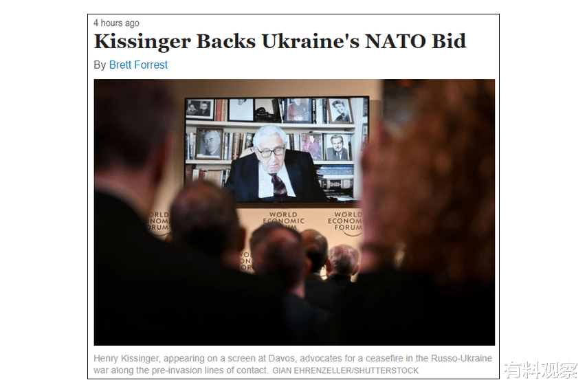 消息提到,美国前国务卿基辛格在俄乌局势紧张(冲突尚未爆发)时曾接受美媒的采访,期间提到了乌克兰和北约关系的问题。他当时表示如果北约选择接纳乌克兰“极不明智”,不管是对美国还是其他国家都不是一个好事情;而且把俄罗斯完全排除在西方体系之外也不是最优选择,难以符合全球利益。基辛格是美国政府内部为数不多的“地缘均势派”政治家,他由于在冷战期间对苏联外交政策的经验丰富,政治主张颇受关注。