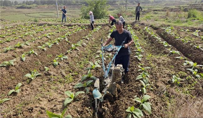 (烟农操作微型培土机进行烟株培土作业)