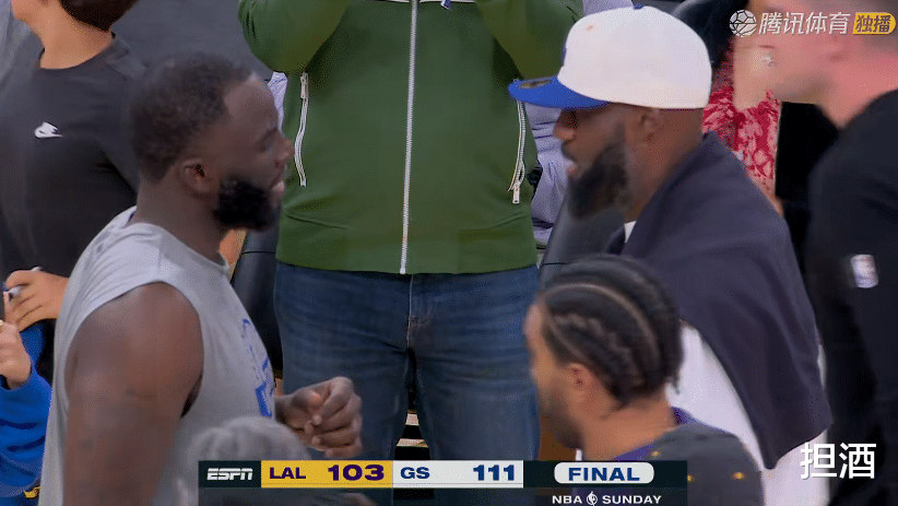 比赛结束,两队球员很友好,在场上互相拥抱致意,格林走入场内,去找老詹,两人在场边有说有笑聊了起来。