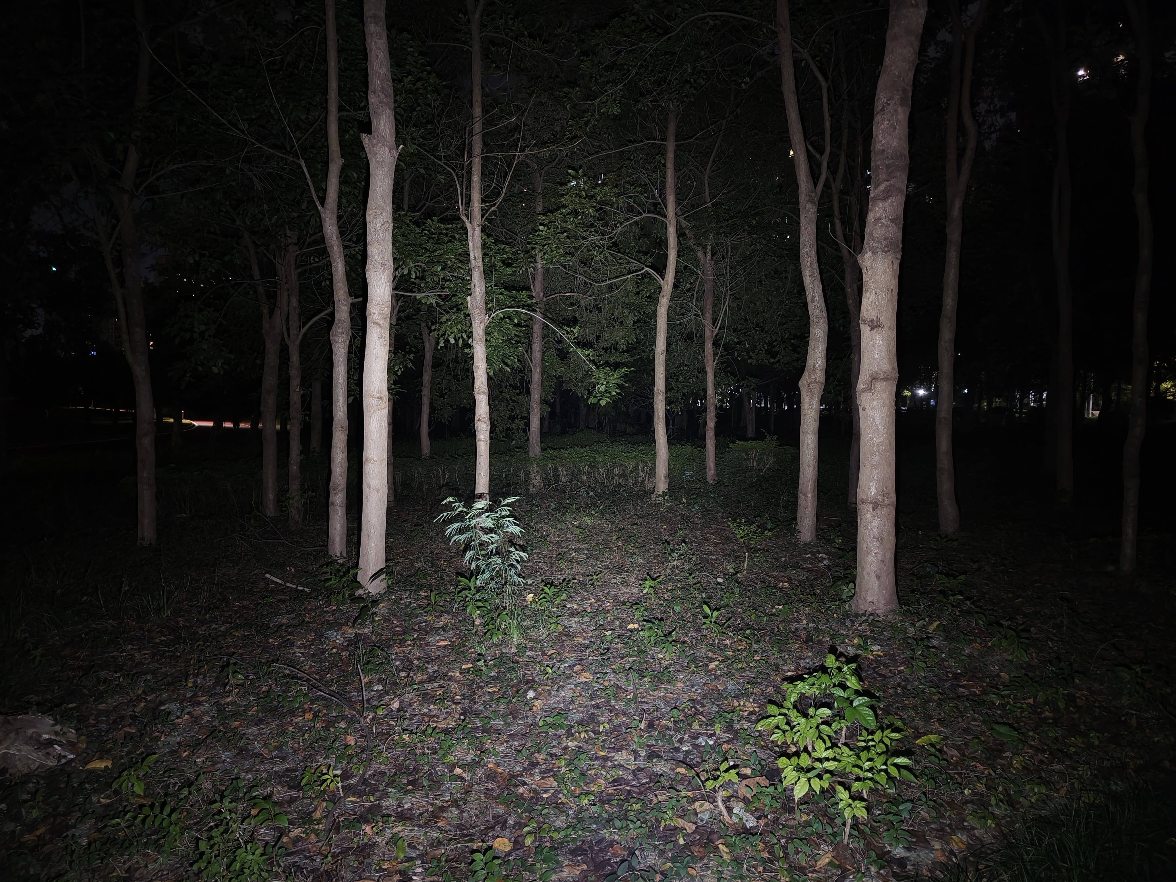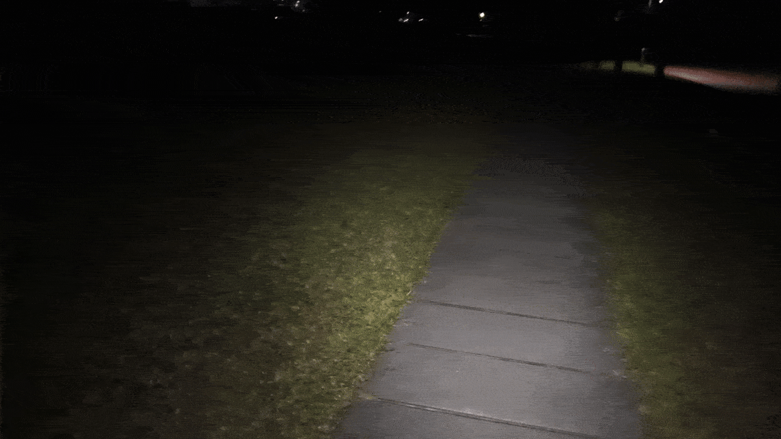 冷白光(6500K)在黑夜里尤为显亮,尤其适合户外空旷范围内的照明。按下开关的瞬间,整个路面被照亮,光线锐利明亮,特别适合需要高亮度的紧急情况。清冷的白光扫过去,树林,小径、灌木都尽收眼底,冷白光轻松穿透了昏暗的环境,给人带来大大的安全感。