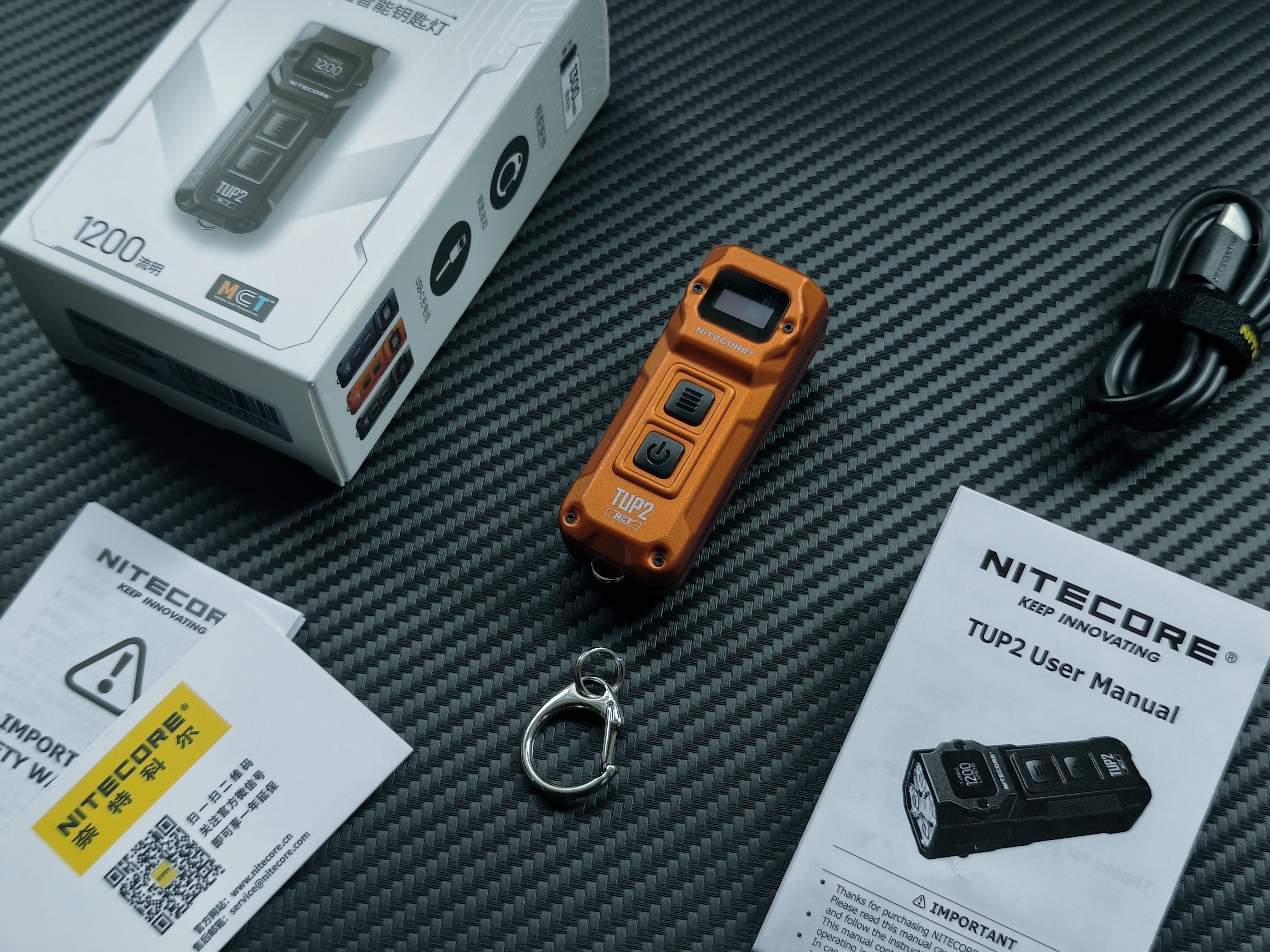TUP2已改往日黑色为底的外包装设计,采用了白底外包装盒,包装内含:手电本体、设计说明书、收纳充电线、保修卡、重要信息说明以及不锈钢钥匙扣。