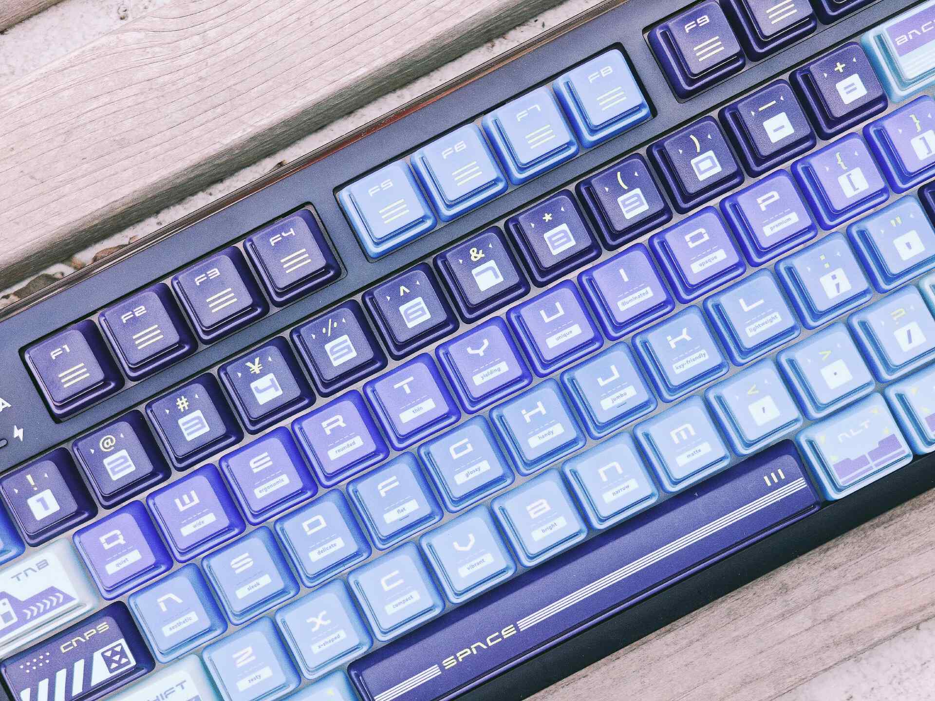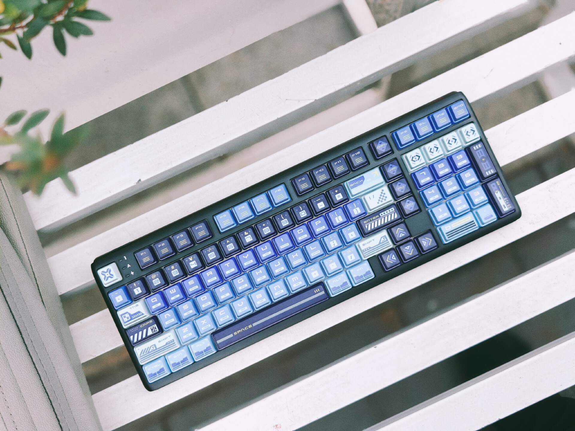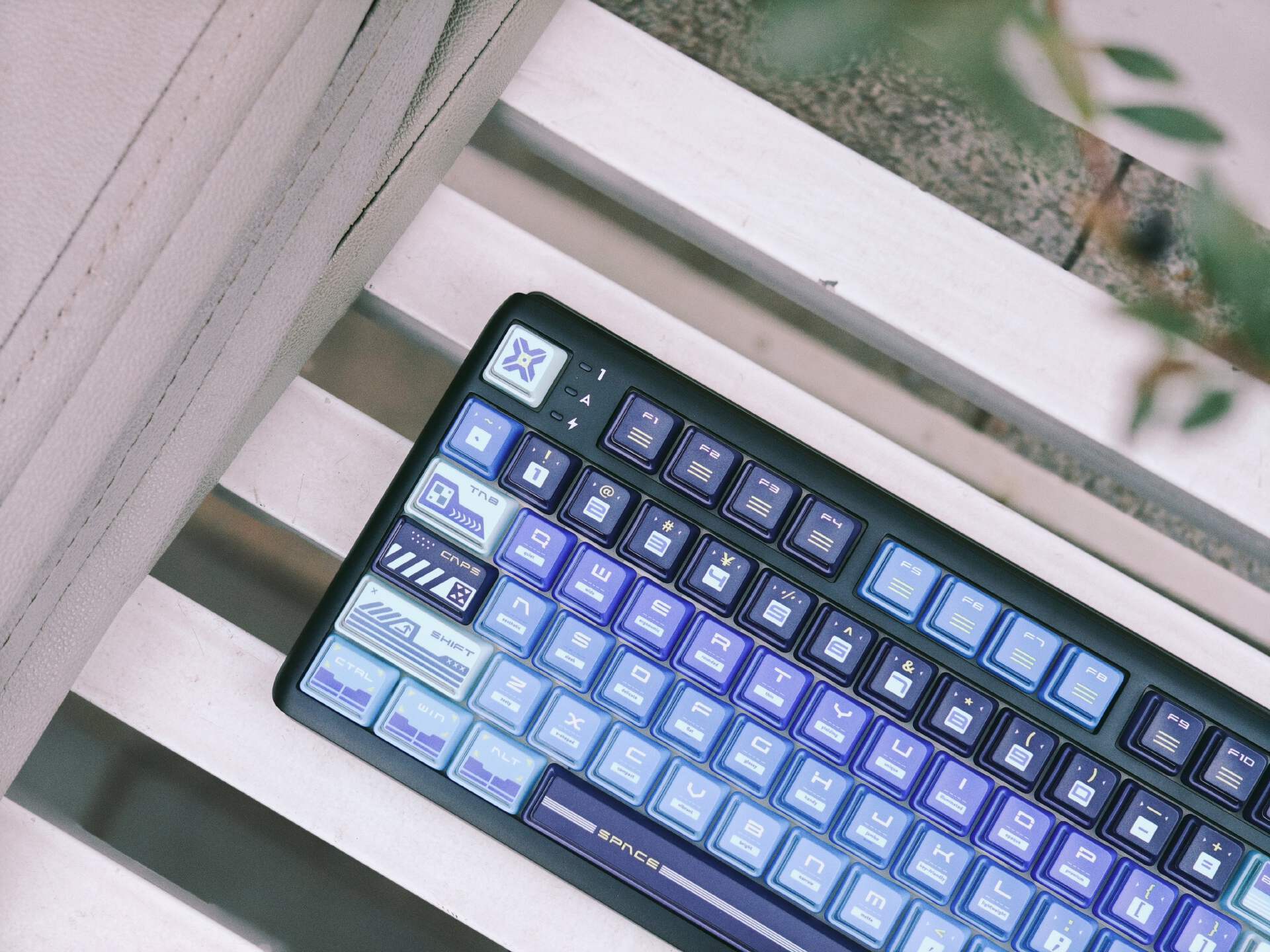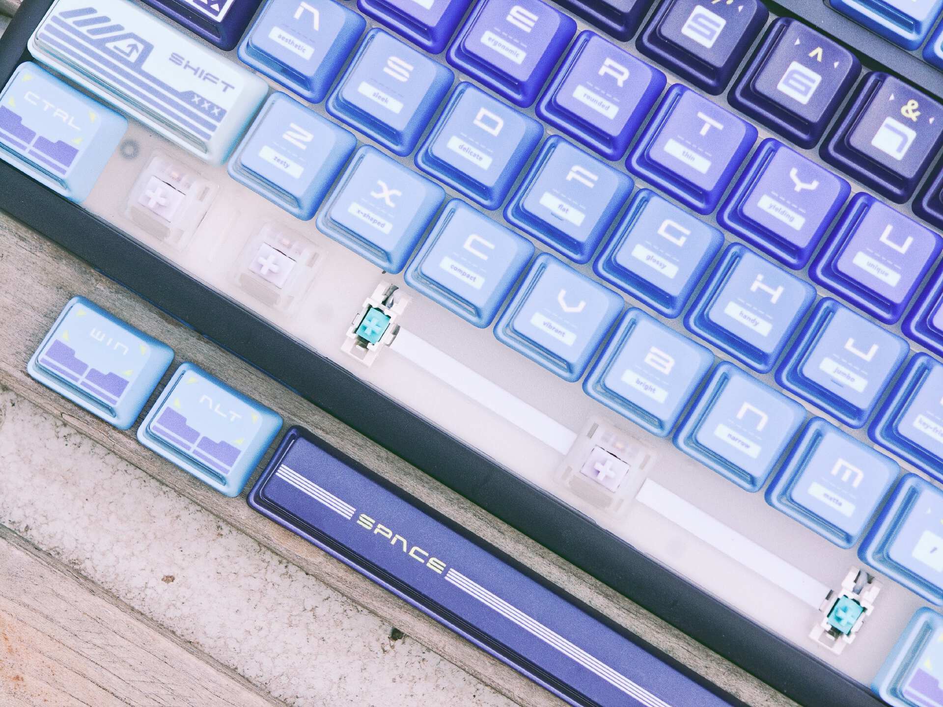 科幻主题配色搭配原厂高度的L型半透PBT键帽,键帽是五面热升华工艺,触感温润舒适而且久用也不怕打油。