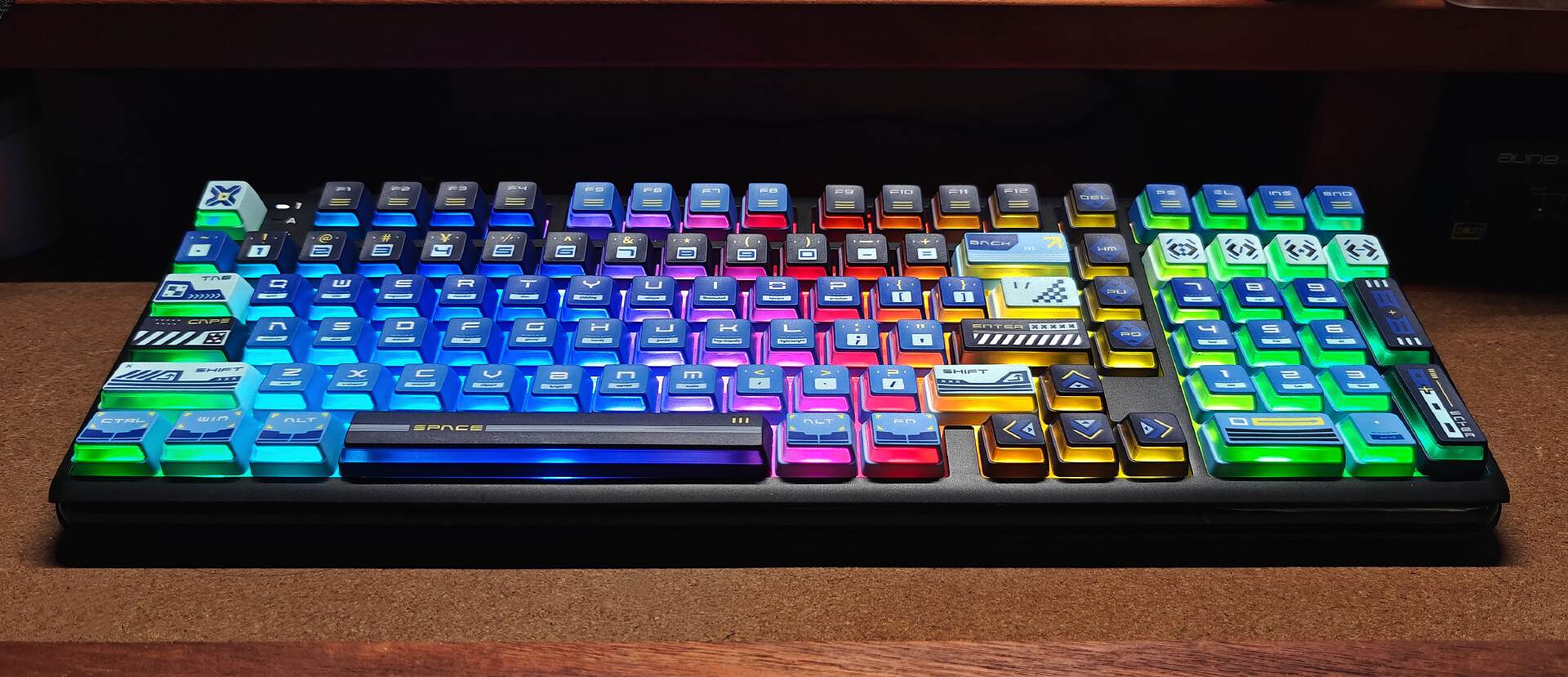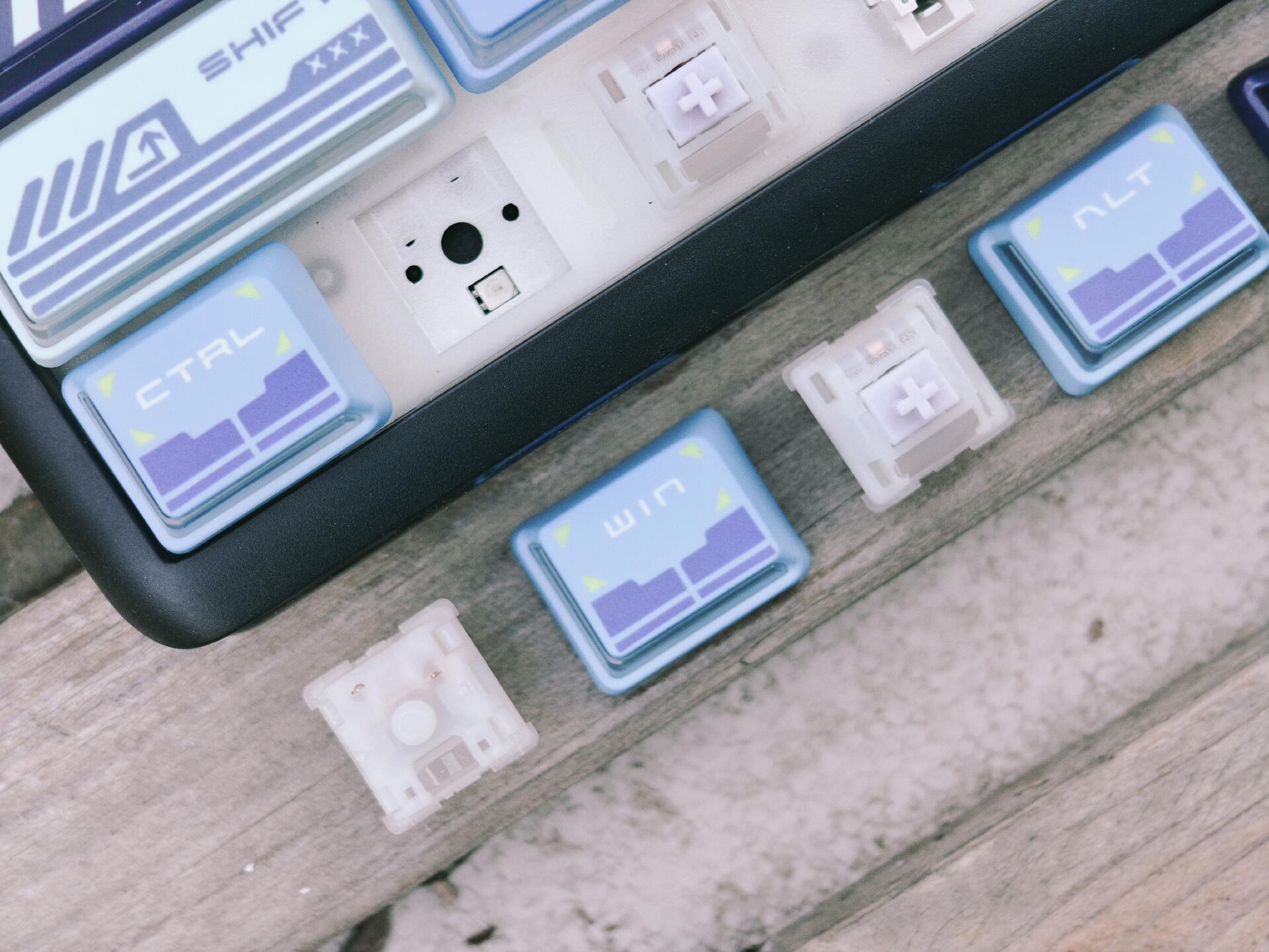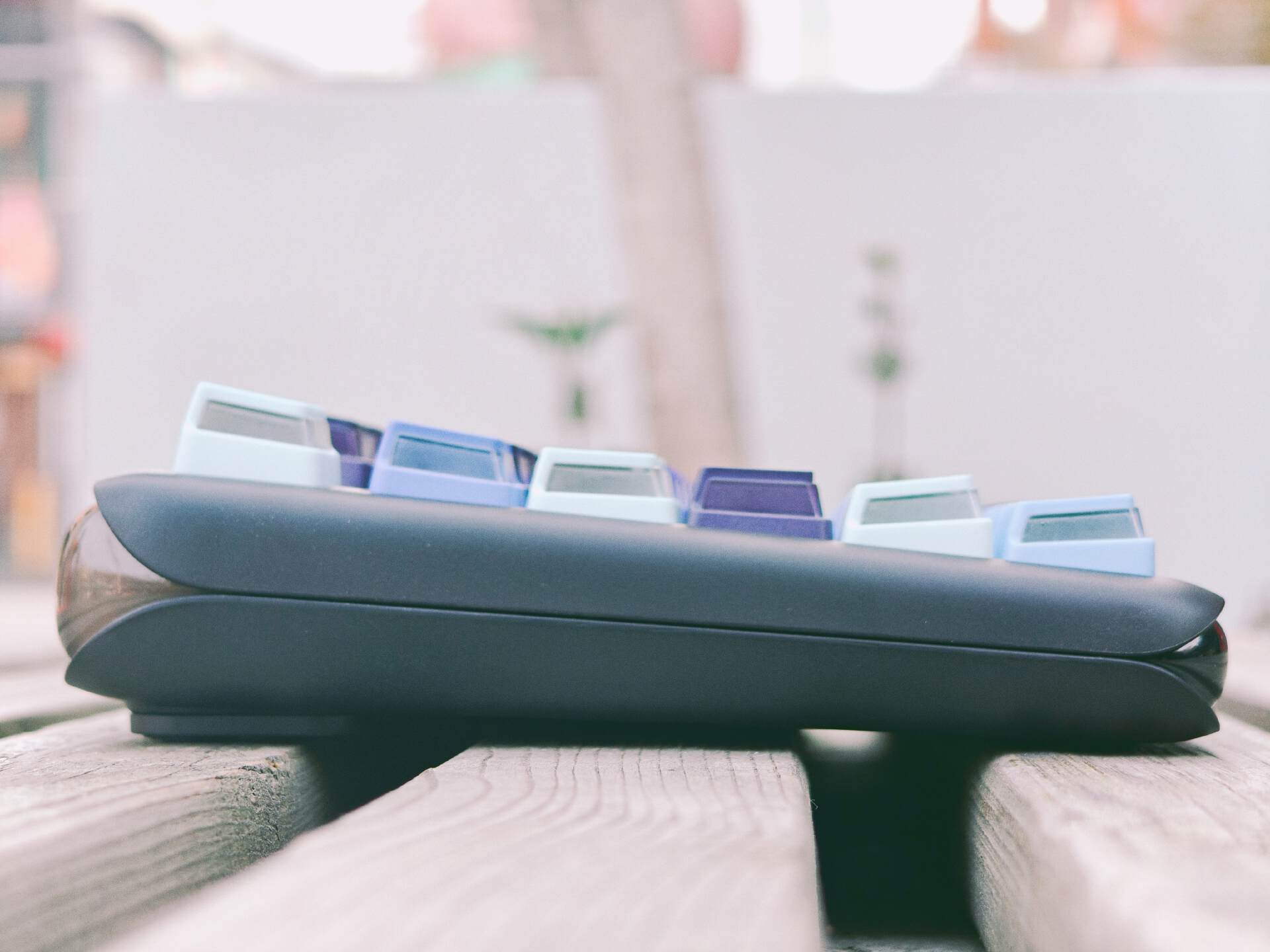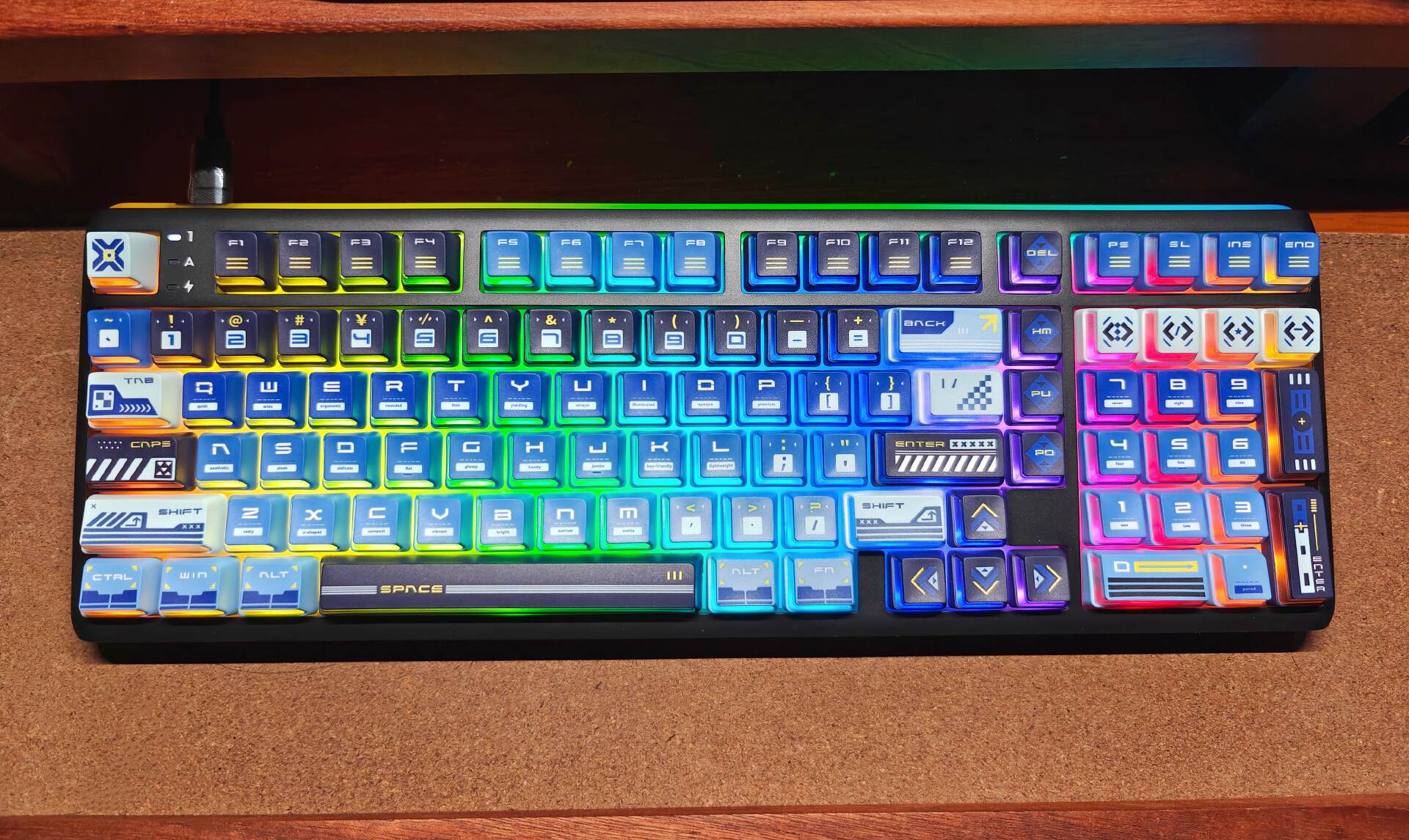 科幻主题配色搭配原厂高度的L型半透PBT键帽,键帽是五面热升华工艺,触感温润舒适而且久用也不怕打油。