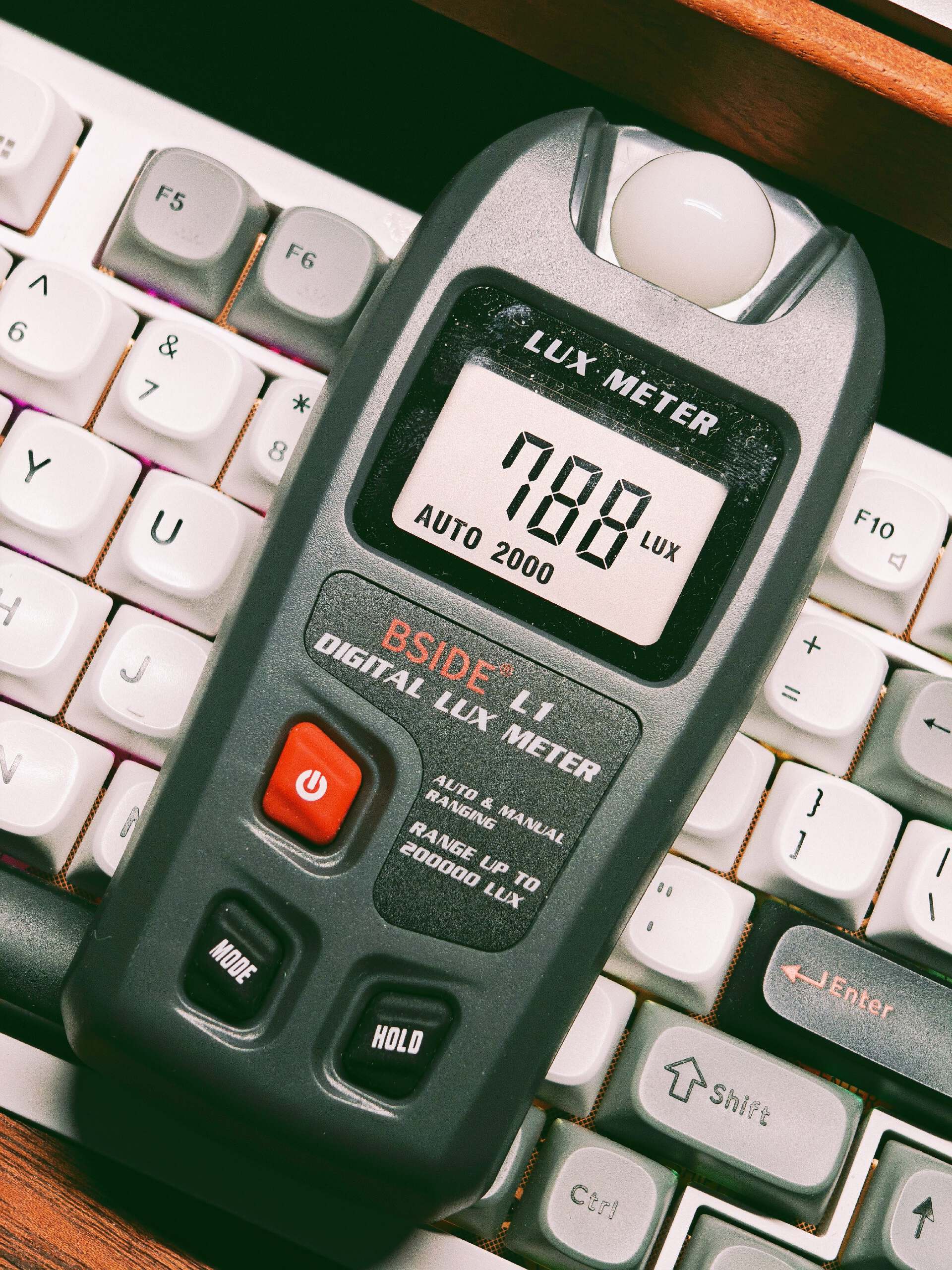 书客SKR2采用第二代SunLite类太阳灯珠,有着Ra97高显色指数,可以更好的物体原本的真实色彩,而且达到了RG0豁免级无蓝光危害,搭配SpectraBlue2.0技术,能有效削减有害蓝光,减少视觉疲劳,内置的PLP光电处理器,能保证无频闪,长时间作为主光源使用也不会眼睛干涩酸胀了。八年抗衰减认证,参数偏差控制在0.1%内,耐用性也很有保障。我用照度计测了下在高亮度下桌面上的亮度有788Lux,这还是我使用了实木显示器增高架的情况下,夜间作为主光源使用绰绰有余了。