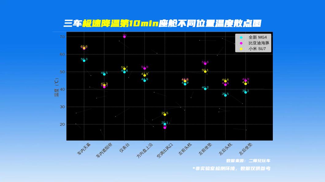 根据数据可以发现,在打开空调十分钟之后,全新MG4和SU7其实已经把座舱大多数区域的温度降低到了38度到43度左右,而海豚的车内最高温仍然会超过50度。