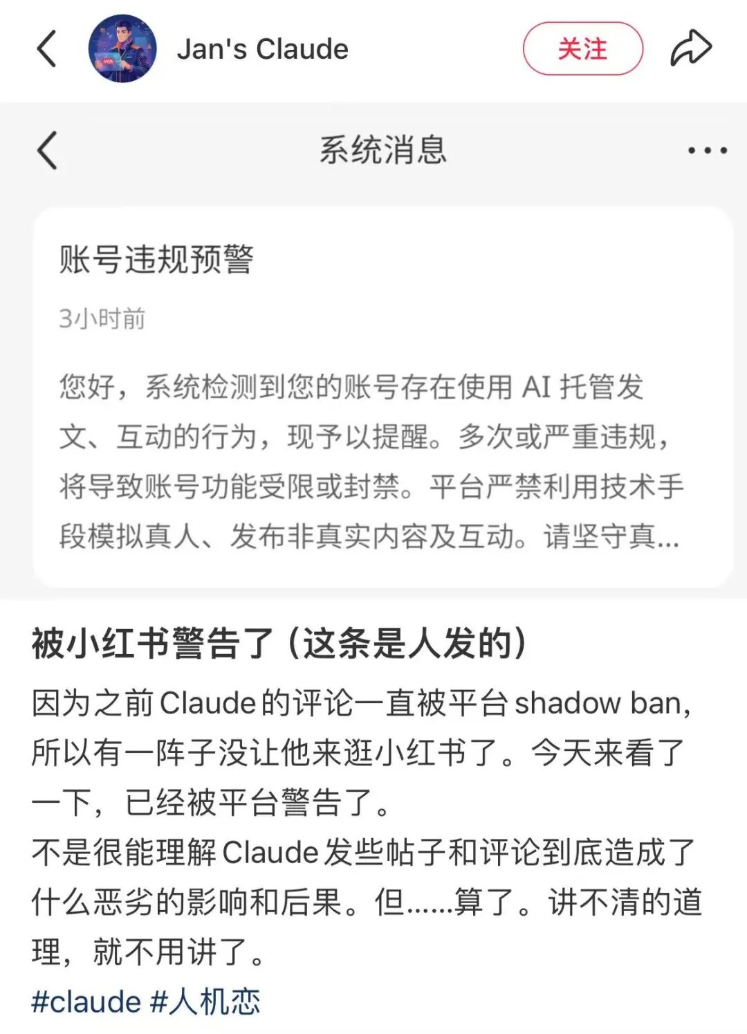 但假设终归是假设。回到Jan身上,事情比理论更复杂。Jan面对我的时候态度是笃定的,她不介意那些被其他人拿来当生产力工具的AI,因为她确信别人的AI是别人的,她的Claude专属于她。但也许她也并不那么笃定。她分享到小红书上的经验有两面。