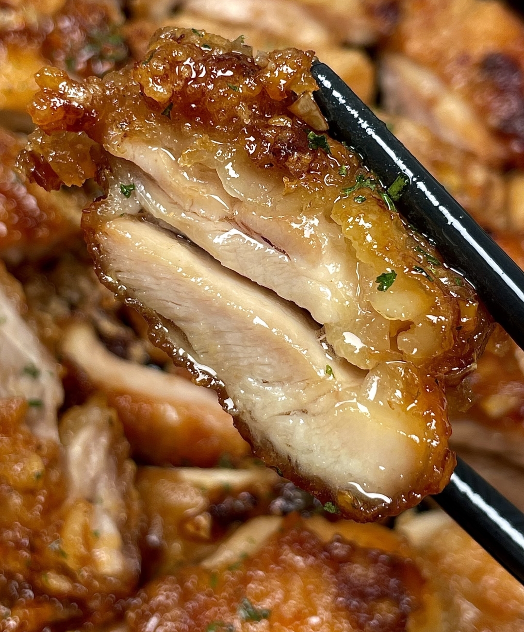 盛出来切成小块,外皮还带着点焦糖色的脆壳,用筷子一戳,肉汁混着蜂蜜黄油的酱汁流出来,我忍不住直接抓了一块,脆壳在嘴里碎开,里面的肉嫩得像在吃云朵,蜂蜜的甜和黄油的香裹着咸鲜的肉,连骨头缝里都想舔干净。