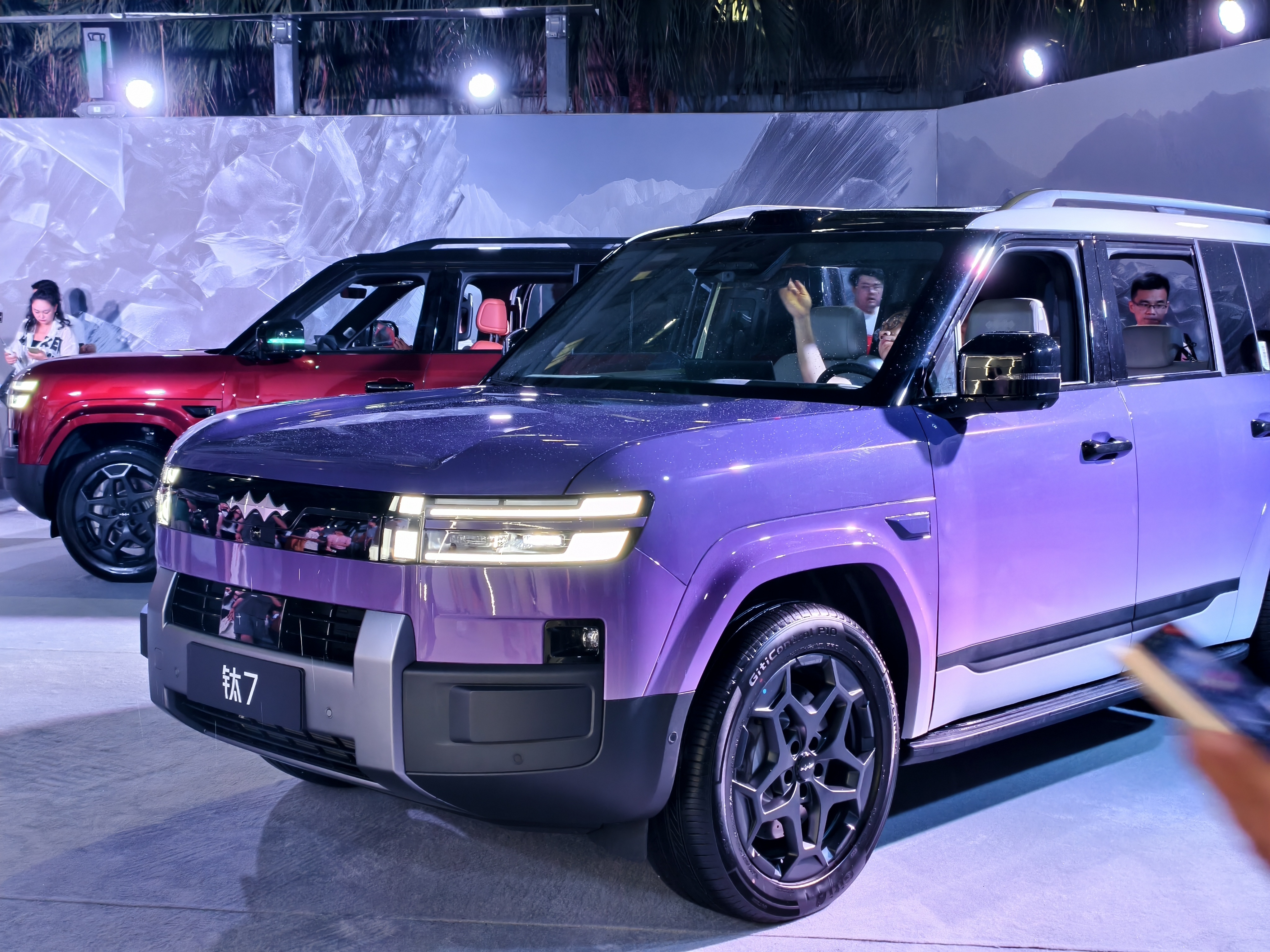钛7近5米的方正车身宛如移动的艺术品,发布会现场展示的「星际灰」配色在灯光下泛着金属光泽 ✨,外挂「小书包」储物盒既呼应越野文化,又提供32.5L实用空间 🎒。最让我惊喜的是官方同步推出的6款潮改方案,渐变色车身与悬浮车顶的组合在发布会舞台上格外吸睛 🎨,甚至有同行博主开玩笑说:「开着这辆车去川西,连无人机航拍都省了,本身就是风景的一部分!」