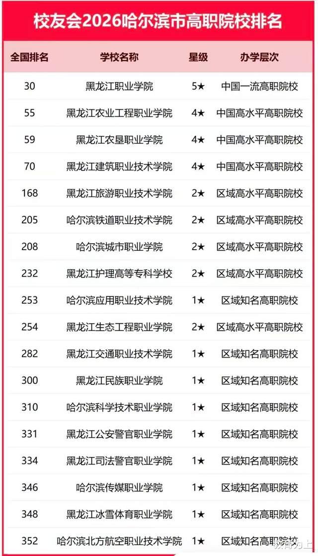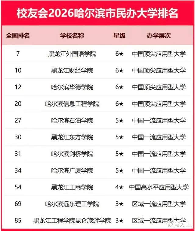 此外,黑龙江外国语学院、黑龙江财经学院居哈尔滨市民办大学前两名,黑龙江职业学院、黑龙江农业工程职业学院居哈尔滨市高职院校前两名。