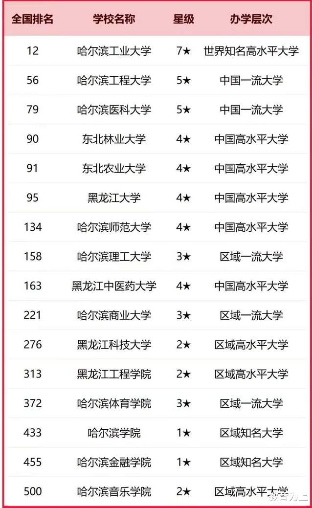 在这份榜单中,共计45所哈尔滨市高校进入榜单,上榜高校既包括我国原985工程大学、原211工程大学的哈尔滨工业大学、哈尔滨工程大学等,也包括哈尔滨市民办大学的黑龙江外国语学院、黑龙江财经学院等。