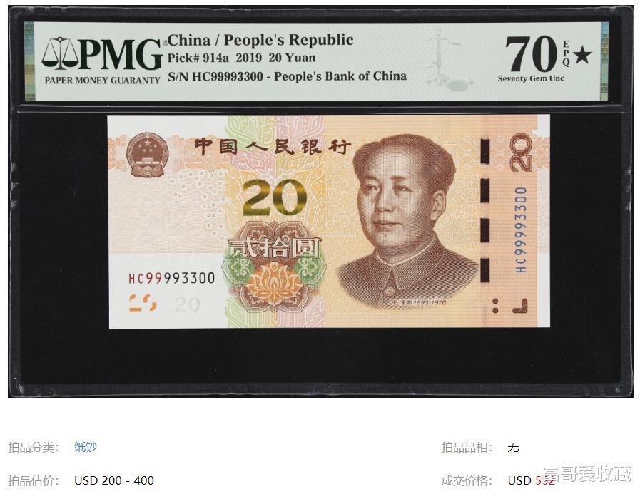 上面这张2019年新版20元,PMG达到了70分,而且带黑星,它的品相接近完美。