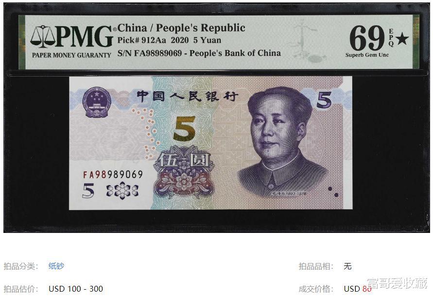 上面这张2020年的5元纸币,首发冠就是“FA冠”,现在已经非常珍贵了。