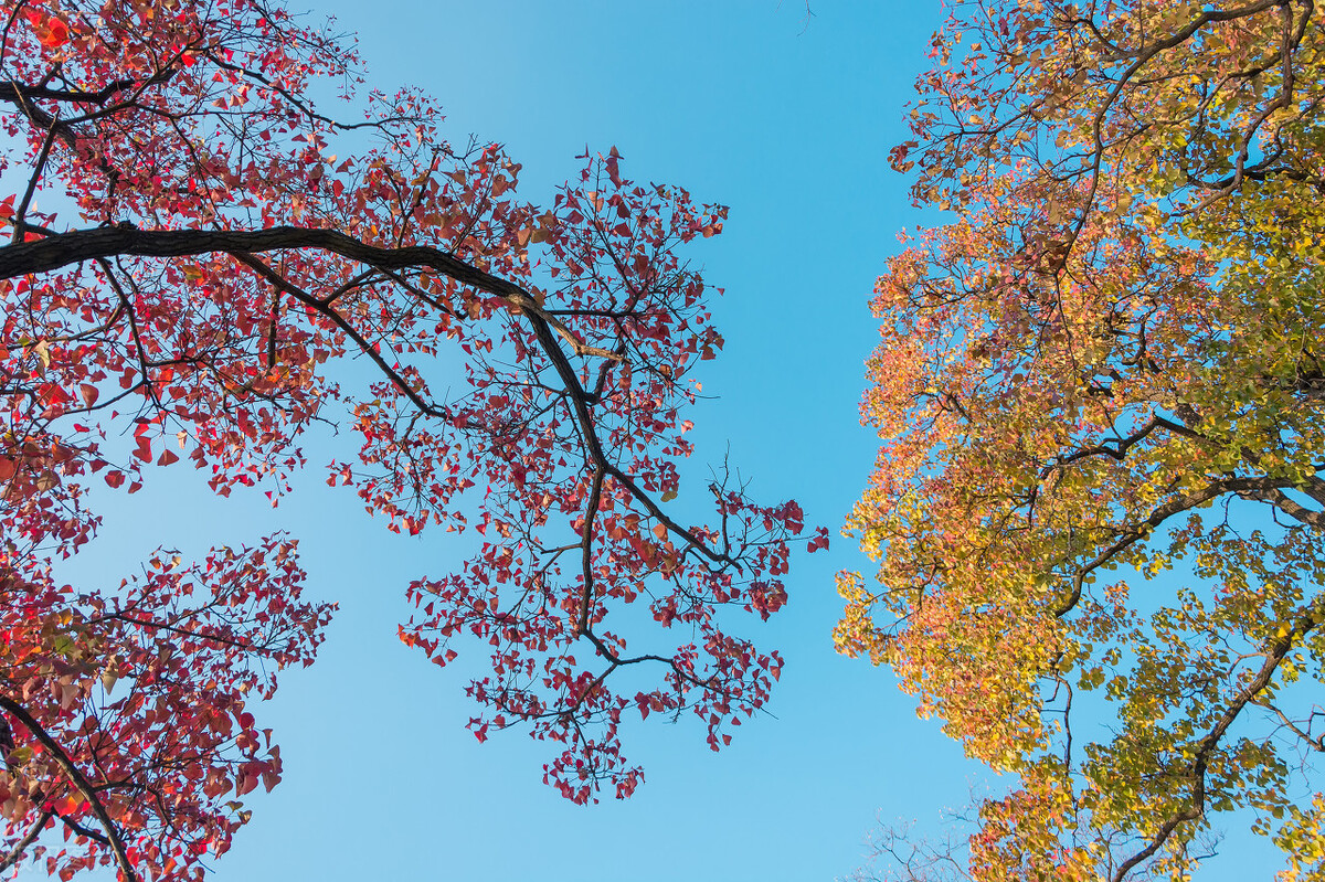 仰拍寻找纯粹的色彩对比,可以让纯净的天空作为背景,再寻找两棵树叶颜色截然不同的树,这样可以让画面色彩对比更加突出,从而增加画面的形式感。