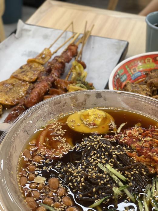 荞麦面嚼着劲道十足,搭配酸甜辣口的泡菜和脆爽梨丝,一口面一口配菜,口感层次超丰富~ 冷面汤里浮着冰碴子,第一口下肚透心凉,解腻又爽口。