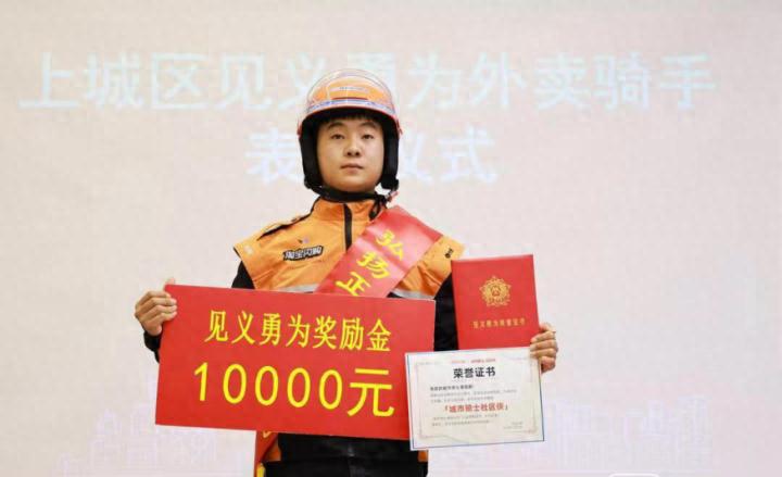 以柴振朋见义勇为为例,比爸爸妈妈慰问祝福先到的,是来自杭州这座城市的认可和表彰。12月16日下午,杭州市见义勇为基金会为骑手柴振朋颁发“杭州市见义勇为积极分子”荣誉证书及一万元奖励金。此外,淘宝闪购公共事务部、上城区彭埠街道等也送上了慰问。