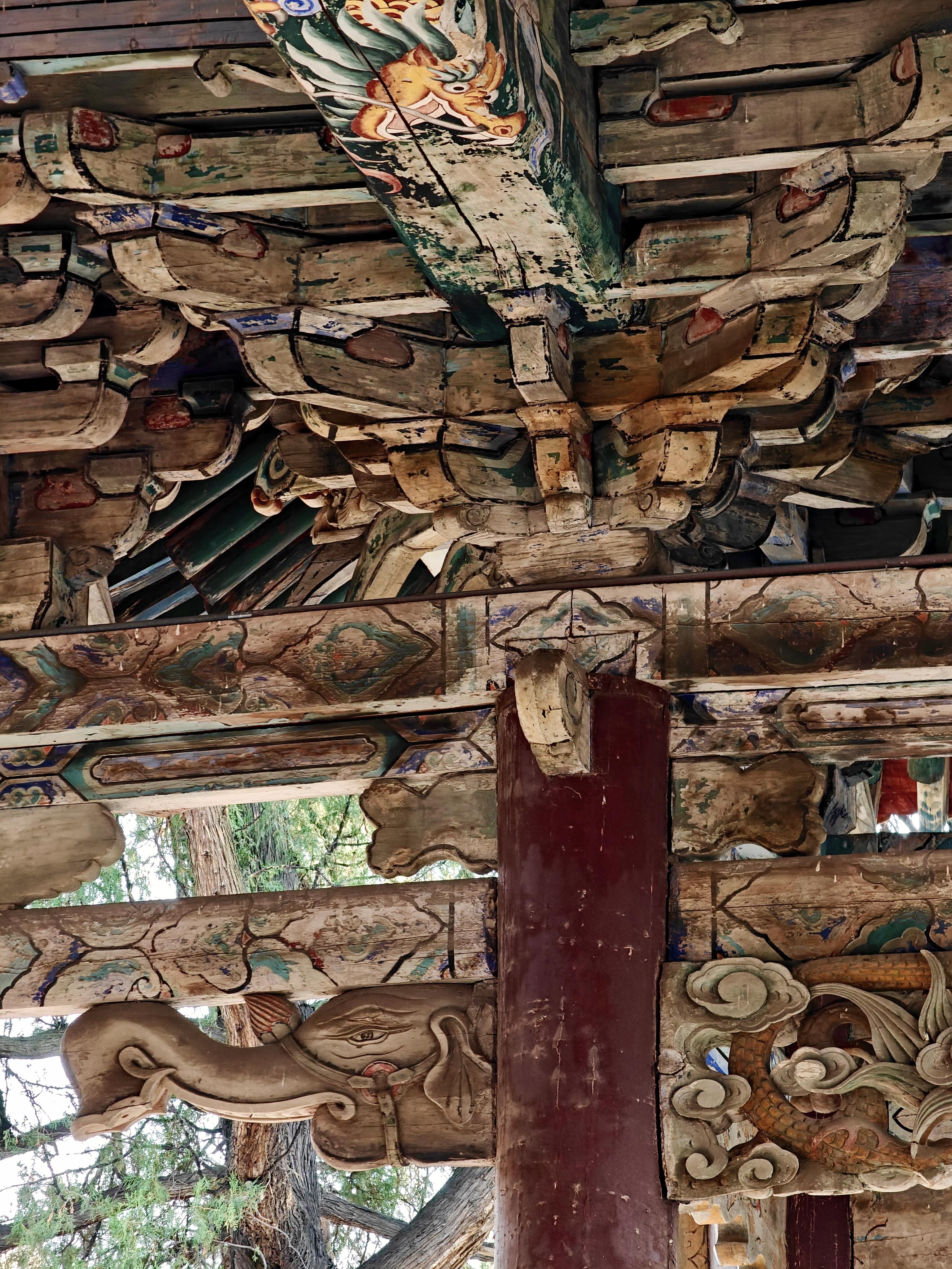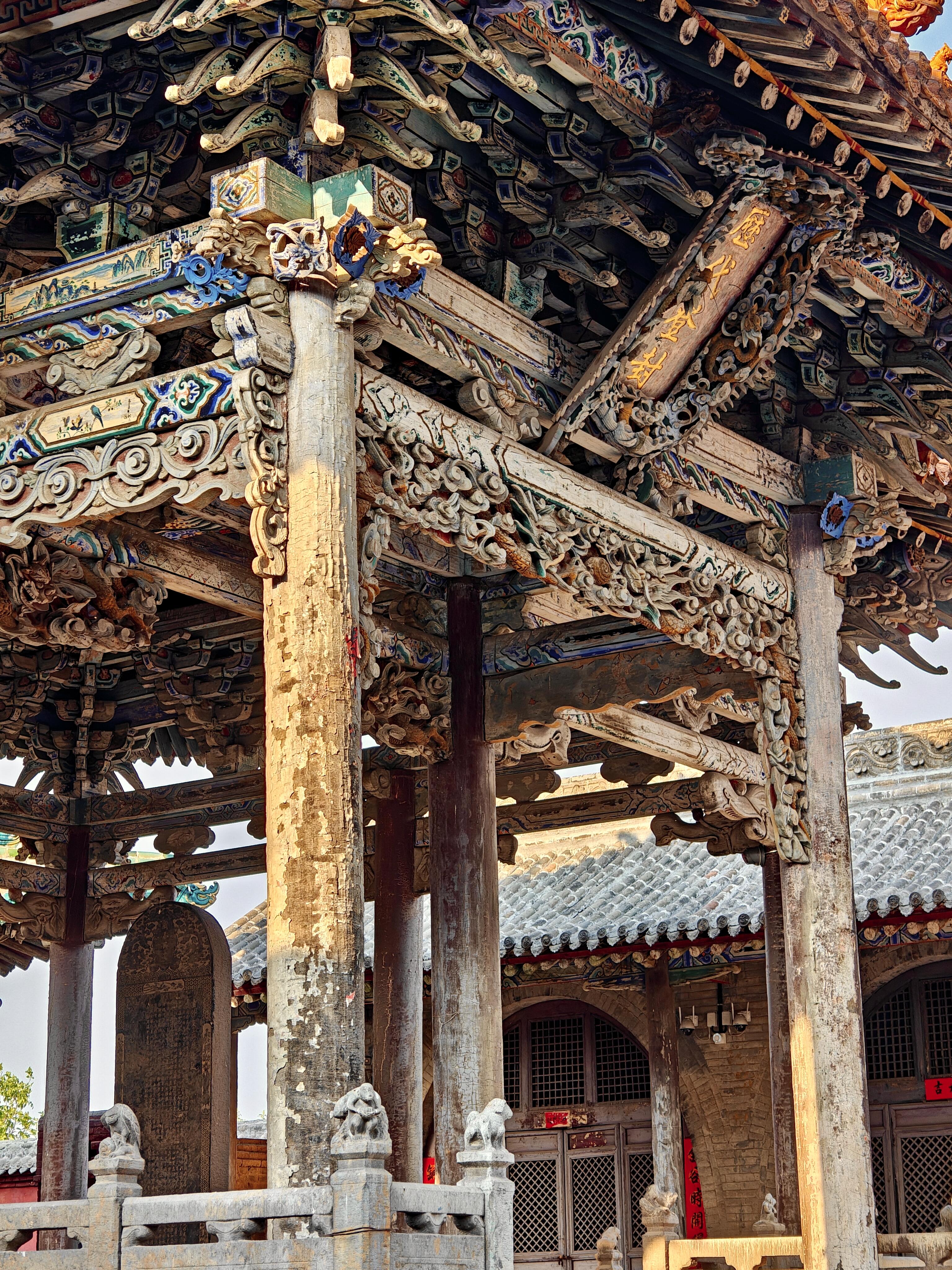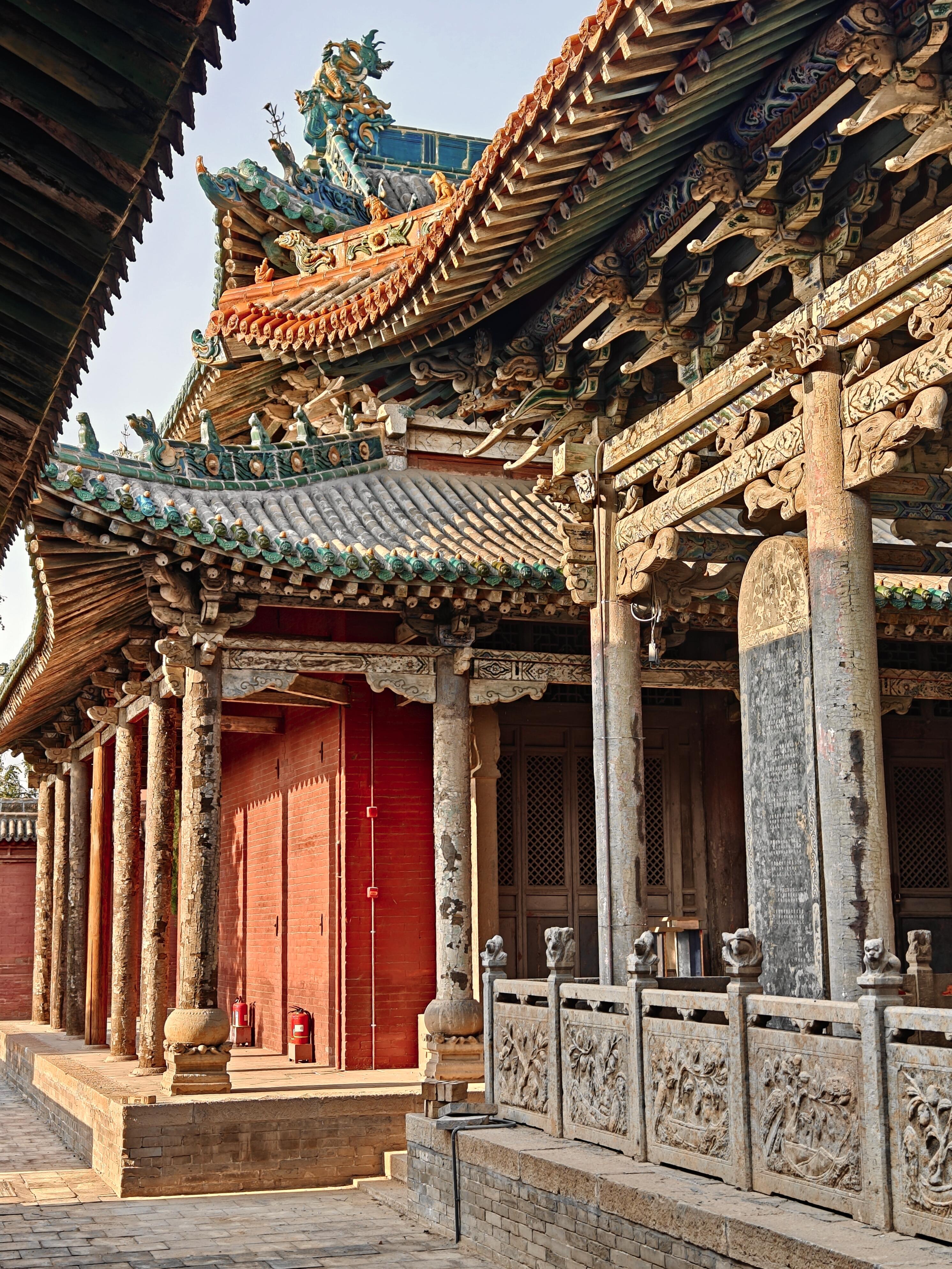 走上半米多高的台基,脚下的石栏板雕刻精美,花鸟鱼虫、瑞兽祥云栩栩如生,每一刀都透着工匠的匠心;殿内的木雕更是极尽精巧之能事,梁枋之上,龙蛇走兽、亭台楼阁错落有致,线条流畅,细节饱满,连枝叶的脉络、兽毛的纹理都清晰可辨。抬头望去,垂脊、戗脊上的琉璃八仙走兽更是惊艳,八仙神态各异,或执拂尘,或持花篮,衣袂飘飘,仿佛正要乘风而去;走兽们则威猛张扬,孔武有力,气势凛然。正脊上的骑士人物形象更是栩栩如生,身姿矫健,仿佛正驰骋在云端,守护着这座庙宇的安宁。这些琉璃作品色彩艳丽,釉色莹润,花卉绚丽富贵,瑞兽灵动传神,完美展现了明清时期介休高超的琉璃烧造水准,让人不得不惊叹,这样的艺术瑰宝,竟藏在这样一座乡间小庙之中。