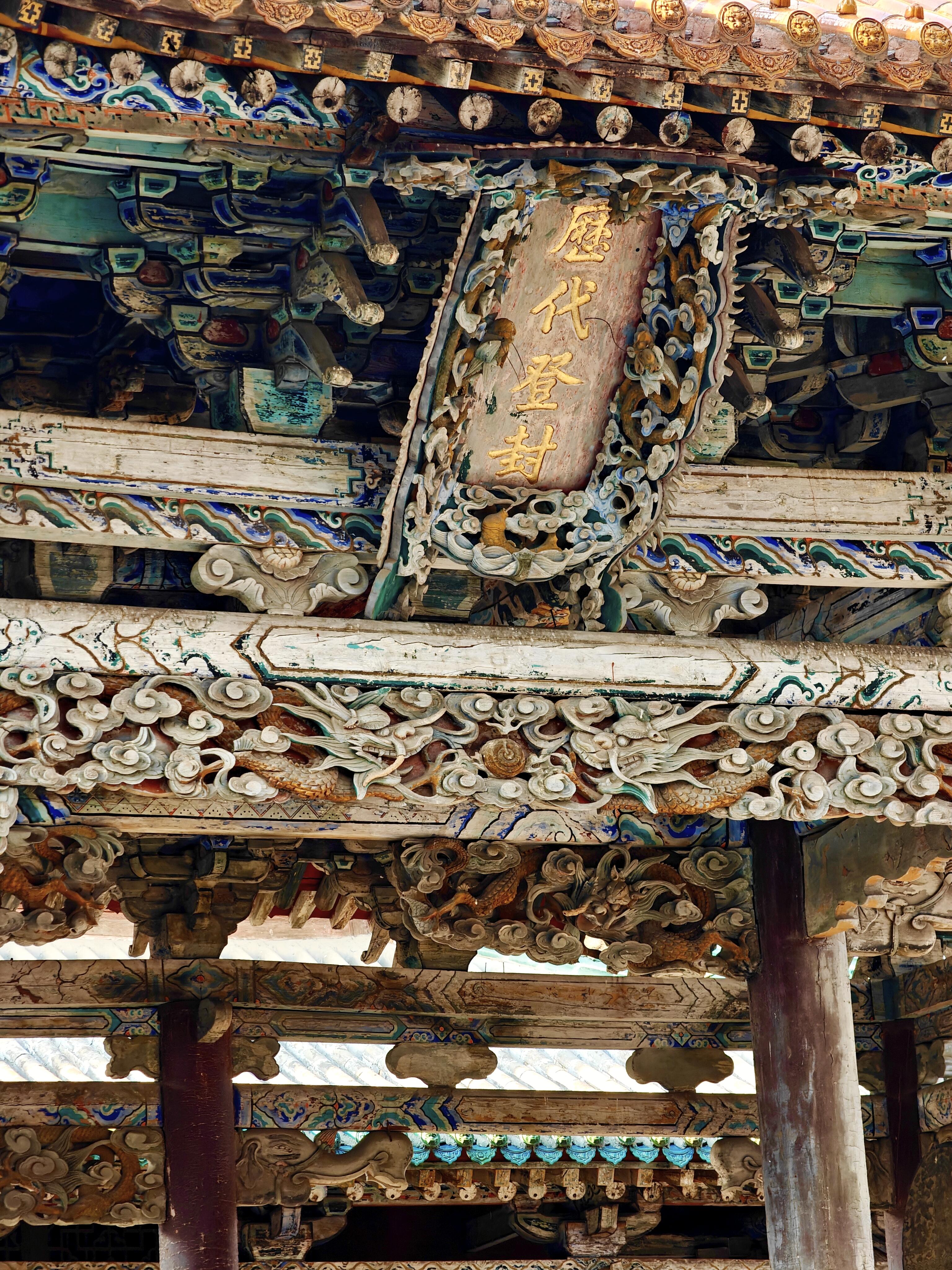 整个庙宇的精华,无疑是那座堪称辉煌壮丽的献殿。尚未走近,便被屋顶流光溢彩的琉璃瓦吸引,黄、蓝、绿三色琉璃剪边层层叠叠,在天光下折射出璀璨的光芒,仿佛将日月星辰的精华都收纳其中。献殿面阔三间,进深两间,卷棚式歇山顶的结构舒展大气,最别致的是明间凸出的单檐歇山小抱厦,檐下三昂七踩斗拱层层叠叠,繁复精巧,每一处榫卯都严丝合缝,尽显古人的营造智慧。斗拱之上,悬挂着“历代登封”的竖匾,寥寥四字,却道尽了东岳大帝曾受历代王朝敕封的显赫地位,也为这座乡间小庙增添了几分皇家气派。