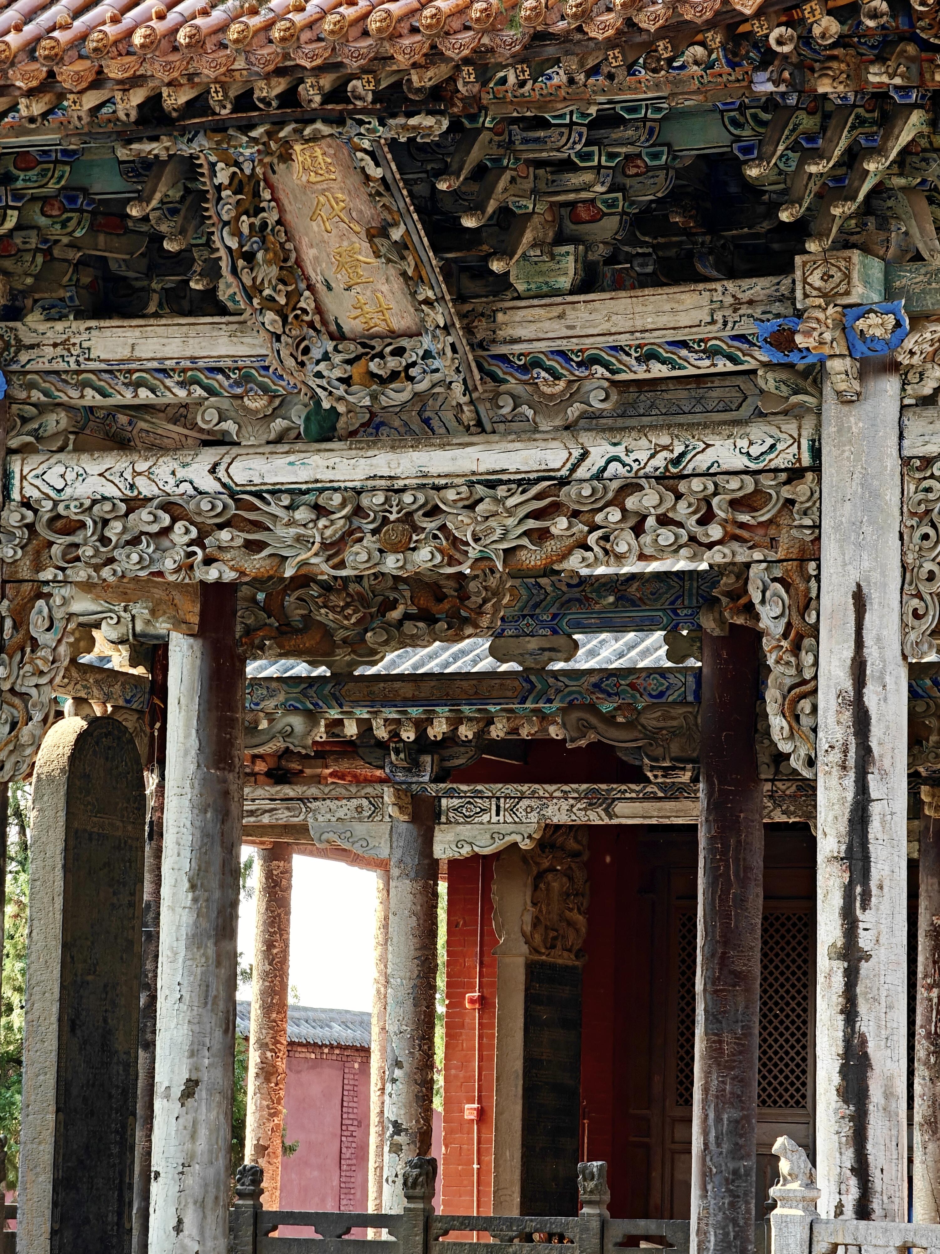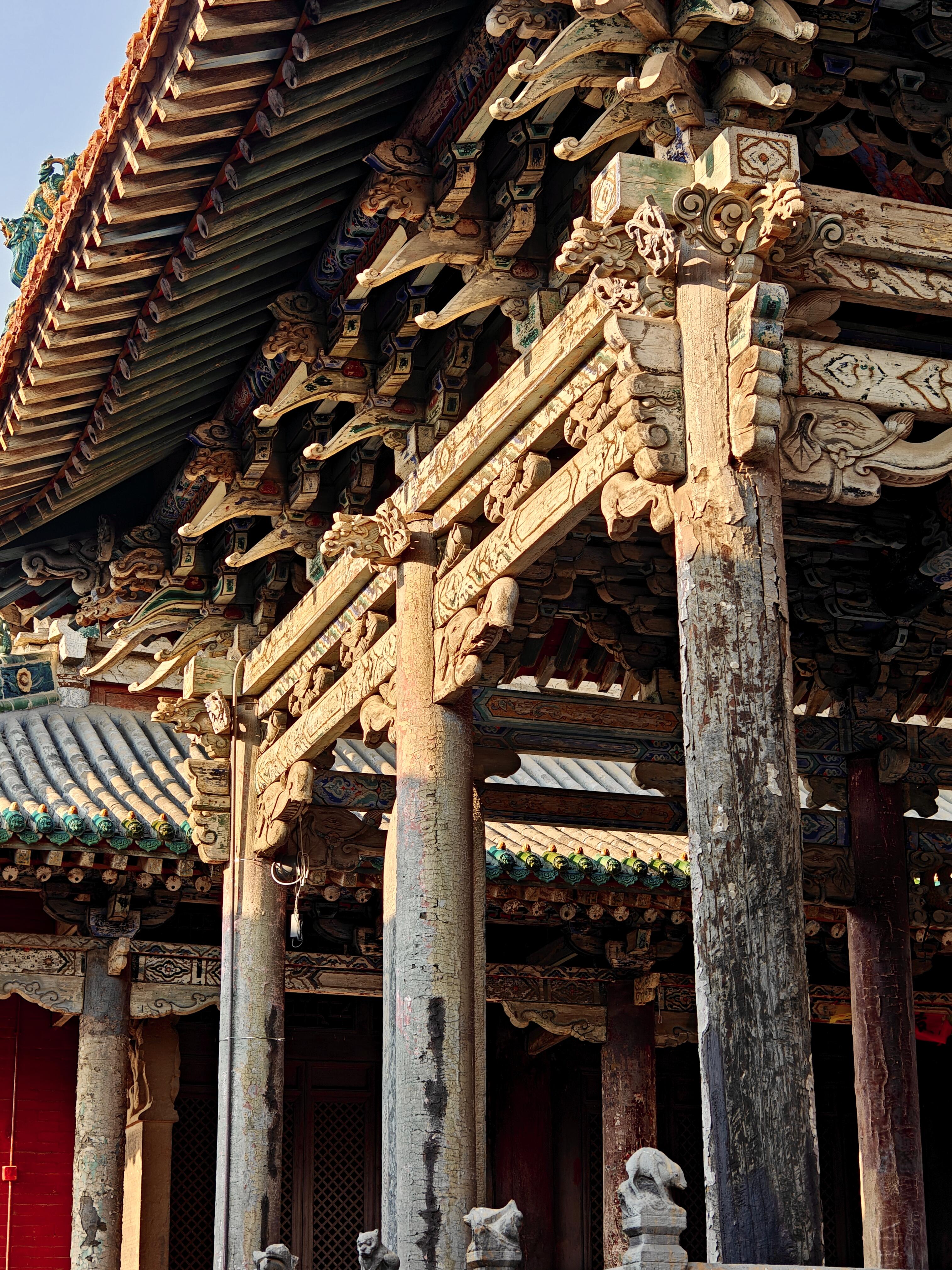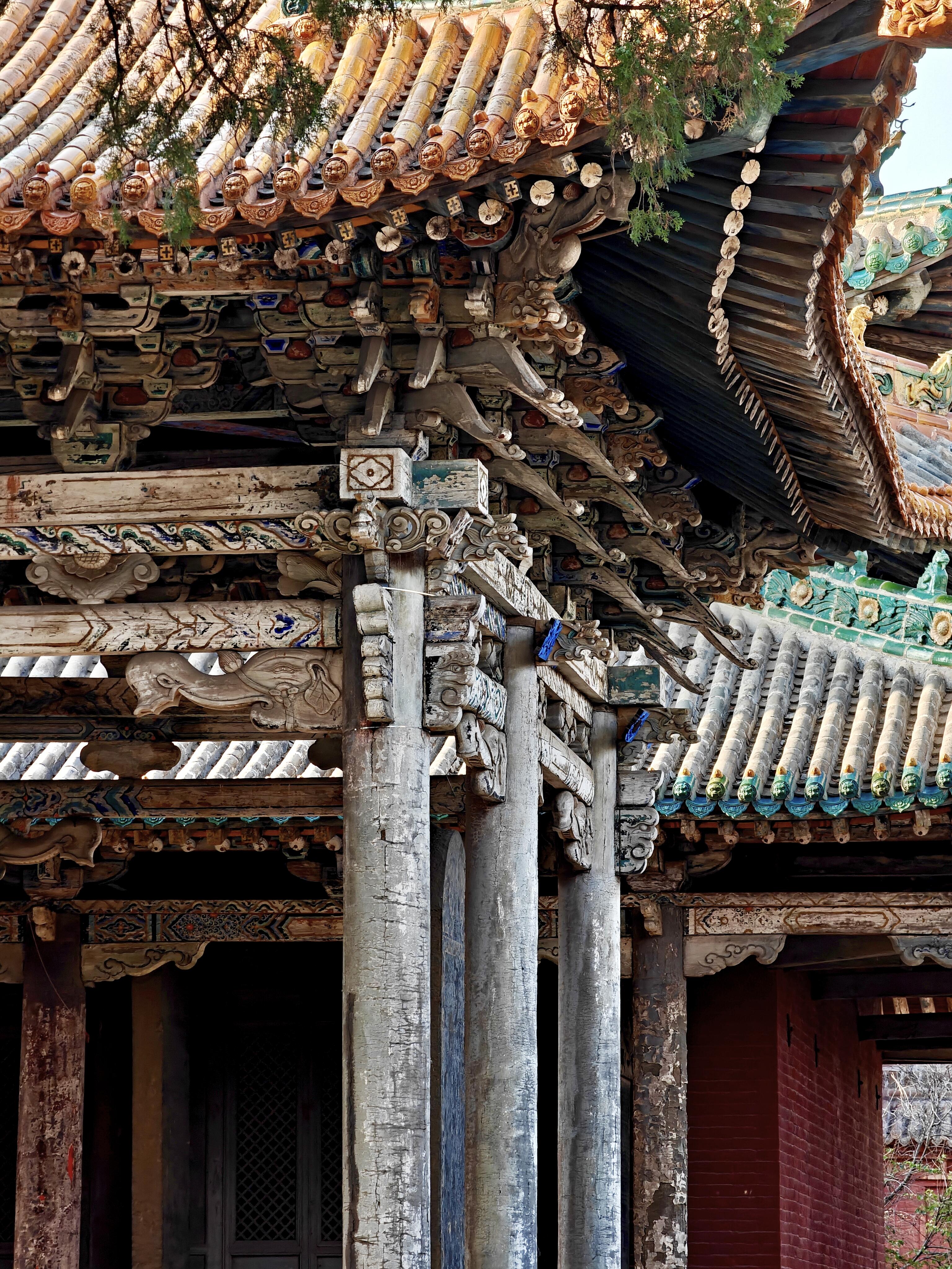 献殿之后,便是庙宇的核心——正殿。面阔与进深均为三间的正殿,重檐歇山顶庄严肃穆,四周回廊环绕,行走其间,木柱与梁枋的阴影交错,平添了几分静谧与幽深。屋顶用蓝色琉璃瓦件铺就,屋面以蓝色琉璃剪边,在阳光下泛着沉静的光泽,与献殿的绚烂形成巧妙的呼应。外檐的彩画虽历经岁月侵蚀,却依旧清晰可辨,青、绿、红三色交织,图案繁复精美,尽显明清建筑的华丽格调。下檐斗拱用一斗三升,上檐用单昂三踩,相较于献殿的繁复,略显低调,却更显庄重沉稳,与正殿奉祀东岳大帝的功能相得益彰。绕到后廊,十余通历代碑碣静静伫立,碑文字迹或清晰或斑驳,记载着庙宇的重修历程与过往的香火盛景,抚摸着粗糙的碑石,仿佛能触摸到历史的温度,感受到历代先民对信仰的执着与坚守。