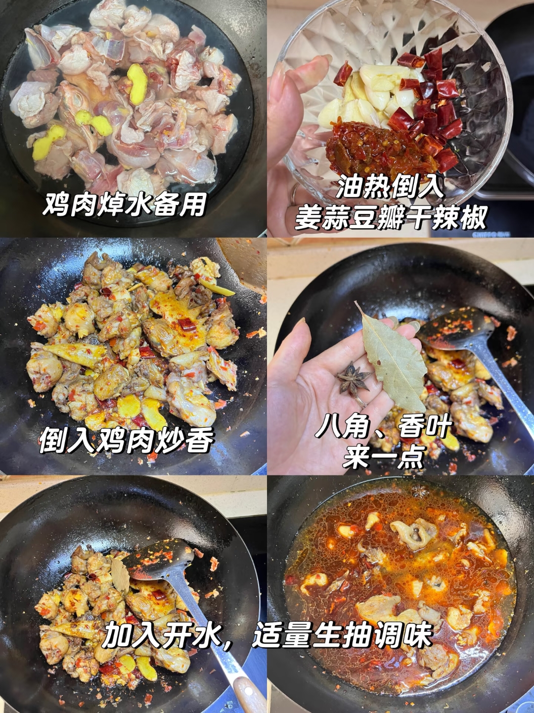 现在开始炒香灵魂酱料!热锅冷油烧到六成热(微微冒烟时),转小火下姜片、蒜片和干辣椒,用铲子慢慢扒拉几下,香味立刻就出来了!接着挖一勺豆瓣酱,小火把红油炒出来,这一步一定要有耐心,把酱炒香了后续才会好吃。看到红油滋滋冒泡时,放入八角、香叶和冰糖,炒至冰糖融化,满屋都是香料的香气,口水已经开始分泌了!把沥干水分的鸡肉倒进锅里,转中火翻炒。记住要把鸡肉炒到表面微黄,这样鸡皮里的油脂被逼出来,吃起来才不腻。大概炒3分钟左右,鸡肉表面会出现漂亮的焦糖色,沿着锅边淋一圈料酒,"刺啦"一声,酒香混着肉香瞬间爆发,这就是家常味的精髓啊!