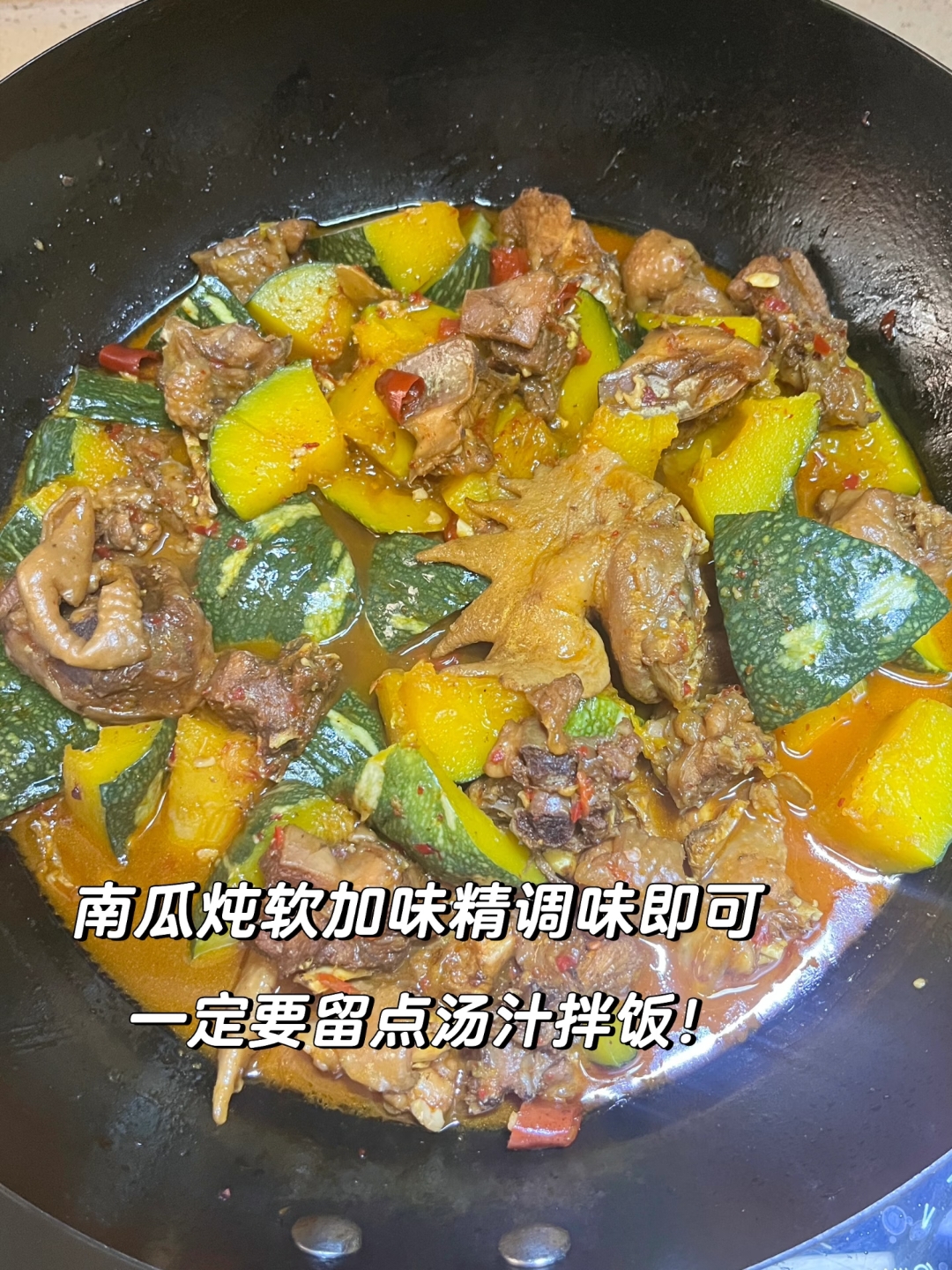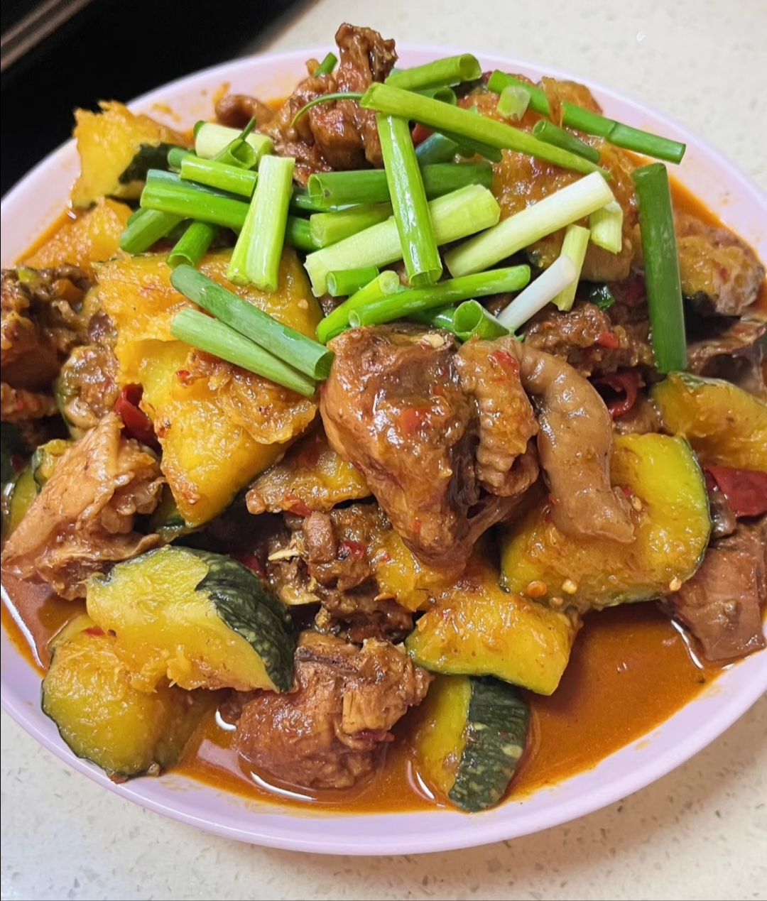 打开锅盖转大火收汁,汤汁浓稠到能挂在鸡肉上就可以关火了。撒一把葱花或者香菜,不撒也行,反正已经香到犯规了!盛出来的时候小心烫,因为你一定会忍不住先偷吃一块——鸡肉鲜嫩入味,轻轻一抿就脱骨,南瓜脆甜带点韧劲,吸饱了肉香的南瓜比鸡肉还好吃!汤汁更是精华,拌米饭能吃三碗,连挑食的小朋友都会捧着碗舔干净。