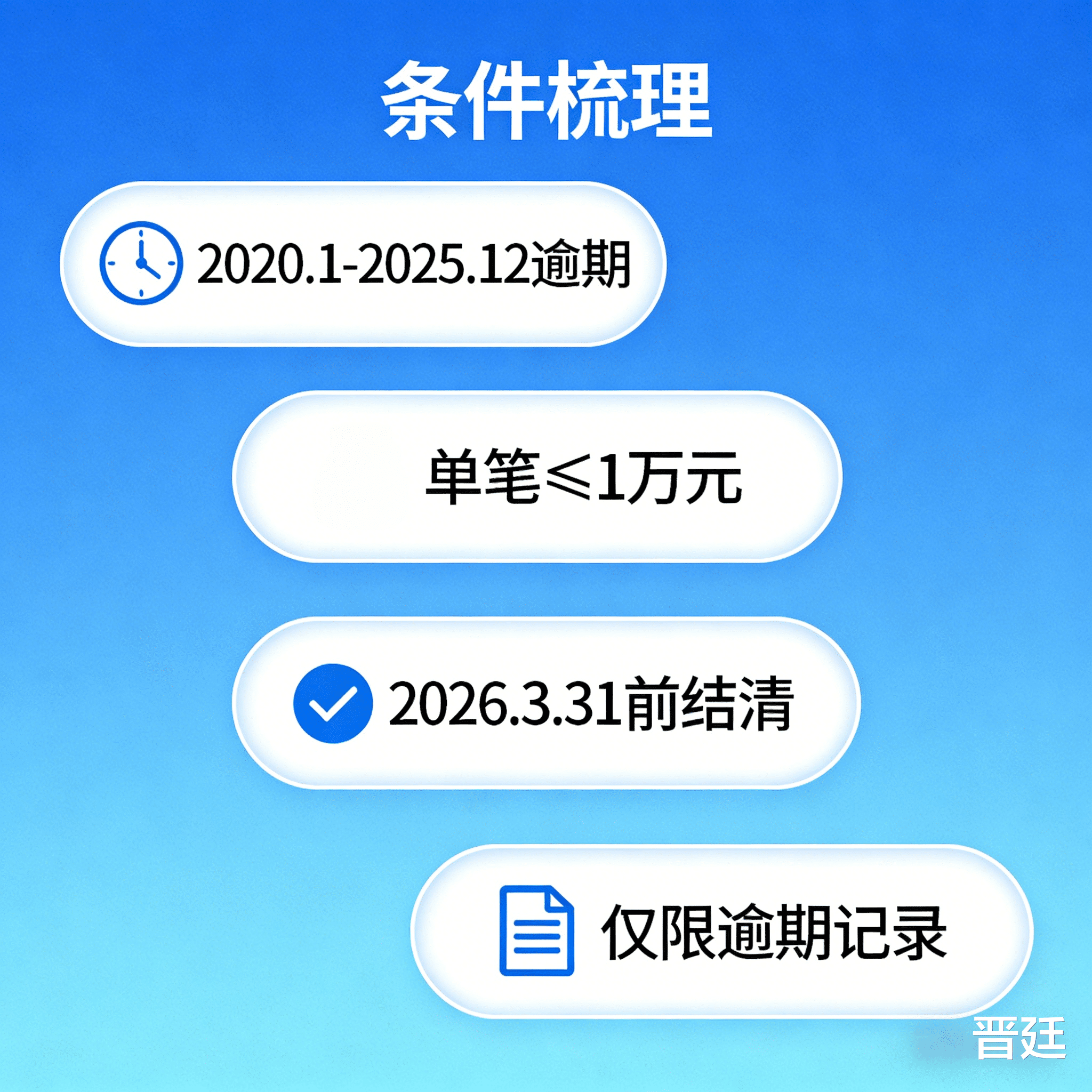 3.金额限制:单笔逾期金额不超过1万元(大额逾期暂不享受该政策);