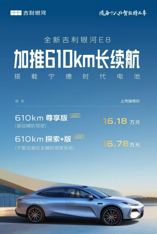 9月11日,吉利银河E8正式推出610km长续航版,2款车型售价16.18万-16.78万元,以“续航+性能+权益”三重暴击直击纯电市场痛点,堪称同级“六边形战士”。