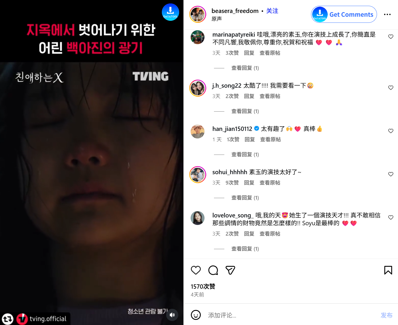 更有趣的是,曾在《我的完美秘书》中饰演她父亲的李浚赫在看到表演后也忍不住留言:“你在做什么啊……小星……啊”,这句充满错位感的评论足以证明奇昭侑的表演多么具有说服力。