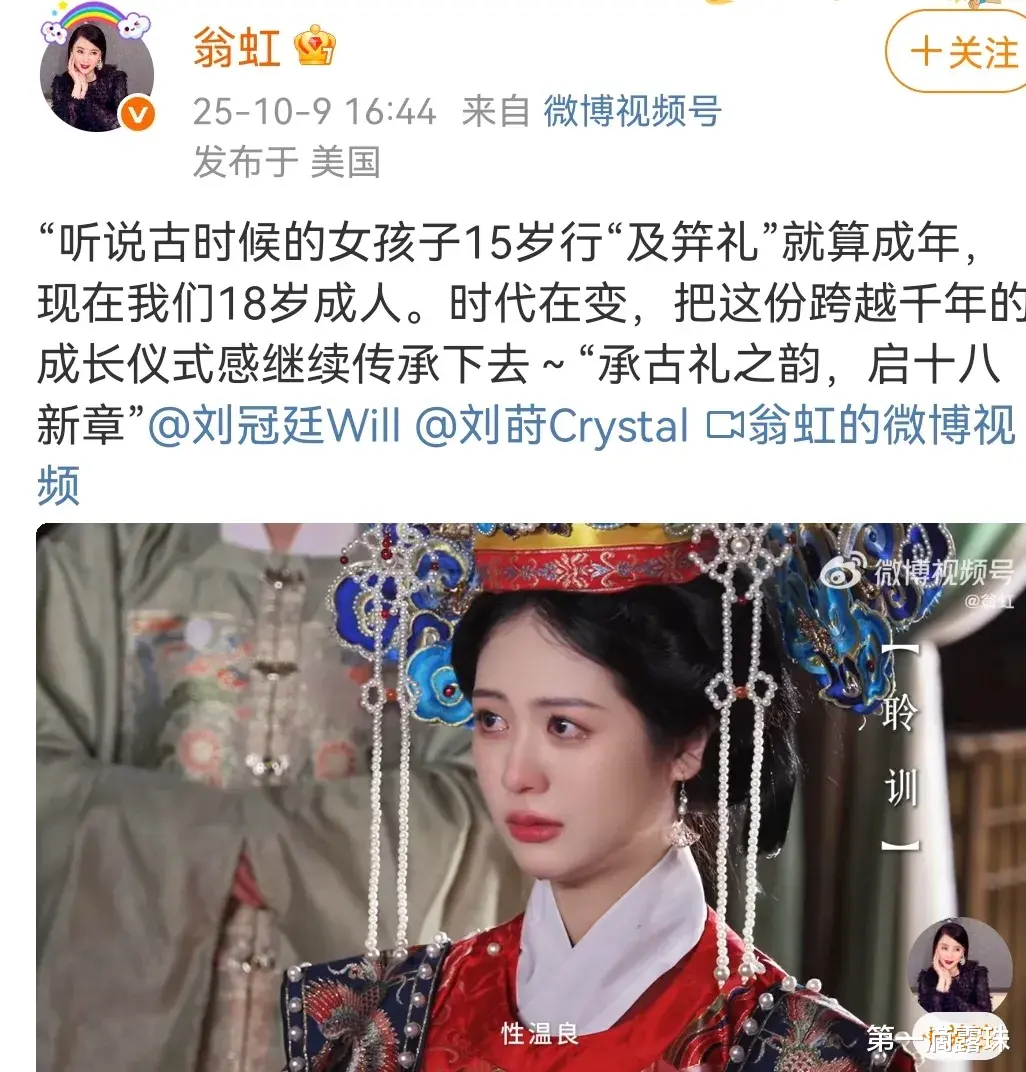 10月9日下午,演员翁虹在个人社交平台发布了一组剪辑视频,视频内容是她与丈夫为女儿小水晶(大名刘莳)举办18岁及笄礼的仪式剪辑。