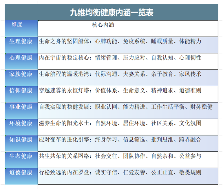 均衡管理理论“九维健康”的理论框架的提出,源于一个朴素的认识:人不是单维度的“经济动物”,而是多维度的生命有机体。真正的健康,绝非“无病即健康”那么简单,而是九个维度的动态均衡: