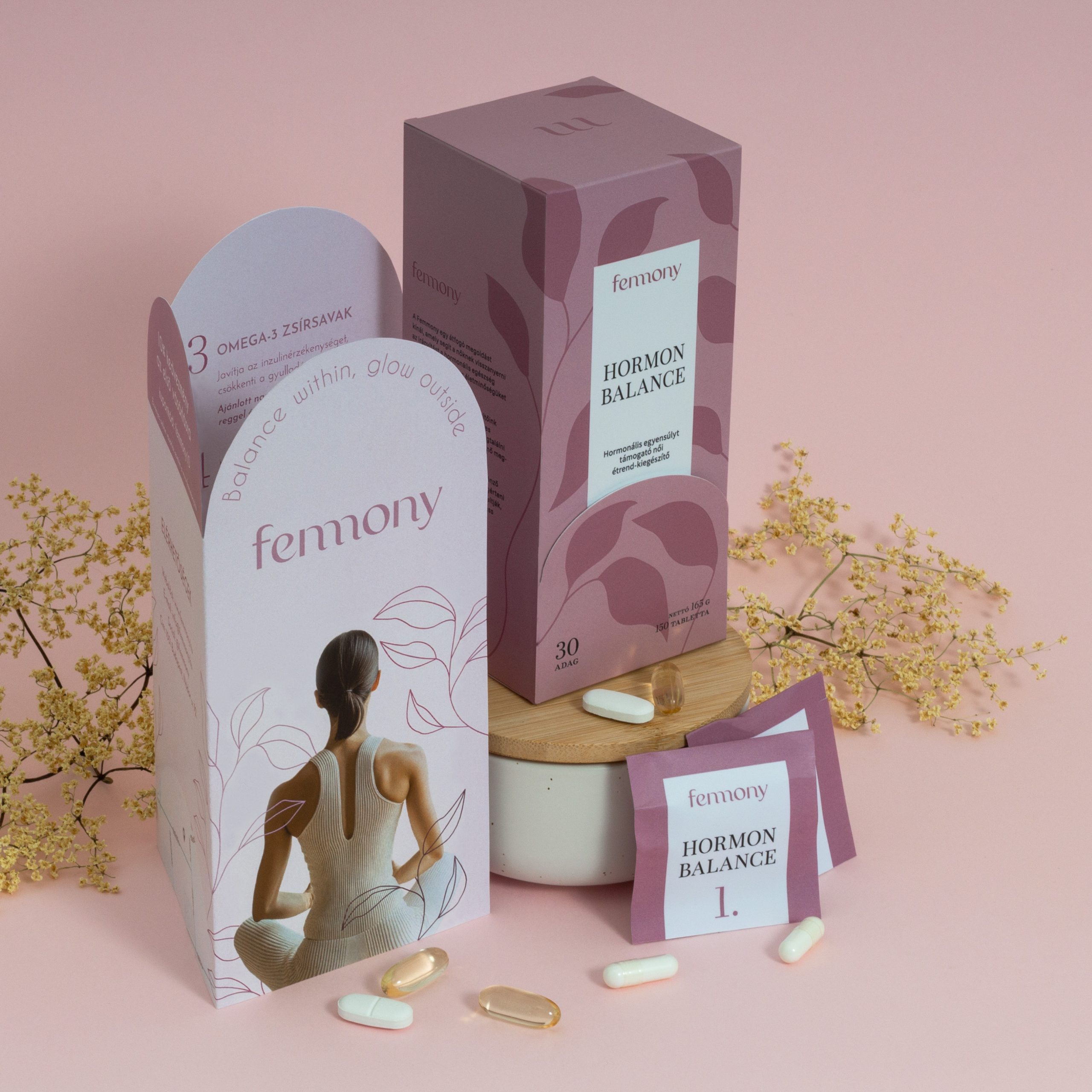 先来看femony的包装。这款包装仿佛是粉色梦境的具象化,以柔和的粉色为主色调,搭配上抽象的叶子图案,营造出一种温馨而优雅的氛围。包装上的文字排版简洁大方,信息清晰易读,让人一眼就能捕捉到其核心信息。而包装的形状更是别具一格,它打破了传统方形包装的束缚,以一种不规则的形态展现,仿佛在诉说着独特与不凡。更妙的是,包装周围还点缀着几枝黄色小花,不仅增添了自然的气息,也让整个画面更加生动有趣。这样的包装,简直就是女性消费者的“心头好”,既美观又实用,让人爱不释手。