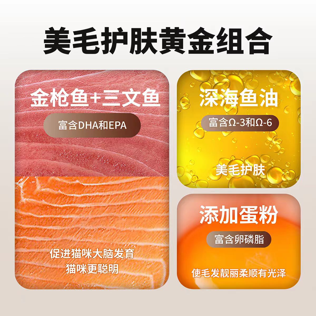 这款猫粮的核心原料,是多种优质的新鲜深海鱼,包括三文鱼、鲭鱼、鳕鱼等,新鲜鱼肉的占比超过75%,动物源成分占比高达88%,为猫咪提供了充足的优质动物蛋白。鱼肉蛋白的分子更小,更容易被猫咪的肠胃消化吸收,哪怕是肠胃偏弱的猫咪,也能很好地适应,同时能为猫咪的毛发合成提供充足的角蛋白原料,让毛发更坚韧、不容易断。更重要的是,这些深海鱼肉本身就天然富含大量的Omega3和Omega6不饱和脂肪酸,不需要额外添加大量人工合成的营养素,天然来源的脂肪酸,不仅吸收率更高,护毛效果也更好,能真正做到天然滋养毛发。