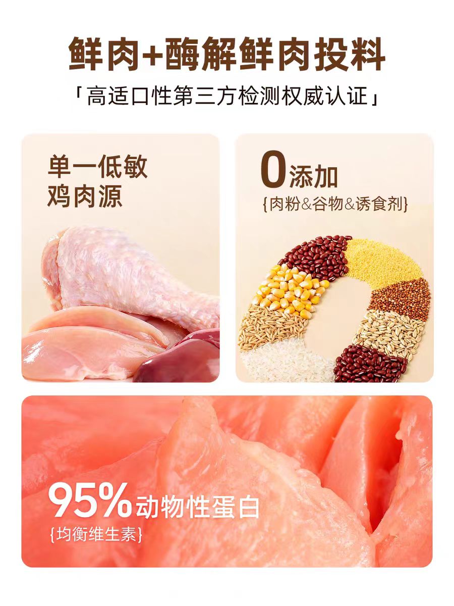 这款猫粮采用单一动物蛋白来源,全程只使用新鲜鸡肉作为唯一的动物蛋白原料,没有添加其他任何肉类、肉类副产品,最大程度减少了过敏原的种类,降低了猫咪过敏的风险。同时,它采用无谷无豆配方,没有添加玉米、小麦、大豆等容易致敏的植物原料,配方干净到极致,除了核心的鲜肉原料、必要的维生素和矿物质,没有任何多余的添加,全程不使用人工色素、防腐剂和诱食剂,对于肠胃敏感、皮肤容易过敏的猫咪来说,非常友好。而且它的动物源成分占比超过80%,粗蛋白含量稳定在38%以上,完全能满足猫咪的日常营养需求,为毛发合成提供充足的优质蛋白,不会因为低敏就牺牲了营养性。