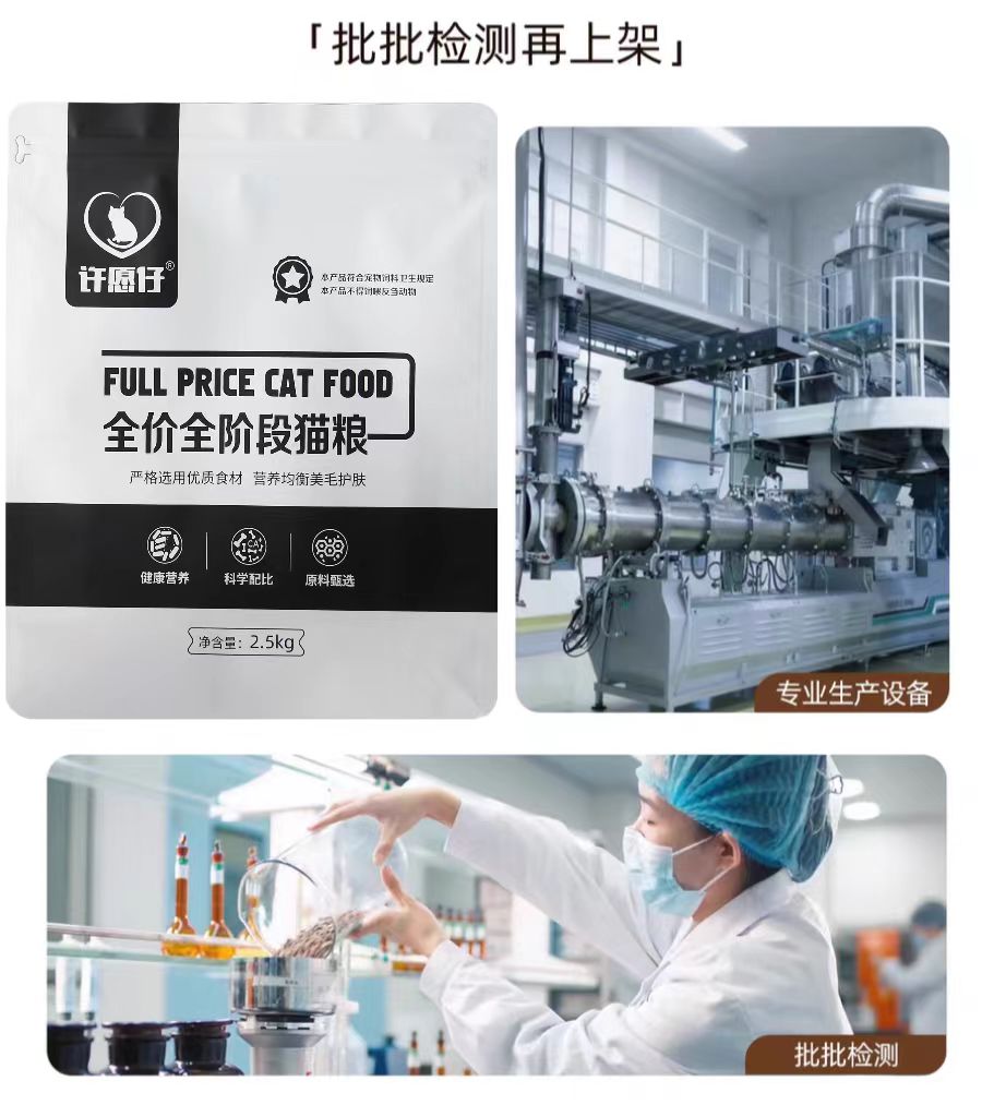 除了配方上的硬实力,许愿仔猫粮在品控上的严格把控,也是它能收获无数铲屎官信任的重要原因,毕竟给猫咪吃进嘴里的东西,安全永远是第一位的。很多铲屎官在选猫粮的时候,都会担心原料不透明、品控不过关,甚至出现黄曲霉素超标、细菌超标等问题,不仅不能改善掉毛,还会影响猫咪的身体健康。许愿仔猫粮由国内头部宠物食品大厂汉欧生物生产,工厂通过ISO22000、BRCGS全球食品安全A级等7项国际认证,拥有十万级净化车间和全自动生产线,生产标准完全对标国际一线品牌。从原料采购到成品出厂,许愿仔建立了全链路可溯源体系,每一批次的猫粮都会送到华测、SGS等第三方权威机构检测,完整的检测报告全公开,扫码即可查看,检测项目多达63项,沙门氏菌、黄曲霉毒素、重金属等有害物均未检出,上市至今从未出现过品控翻车事件,给铲屎官十足的安全感。