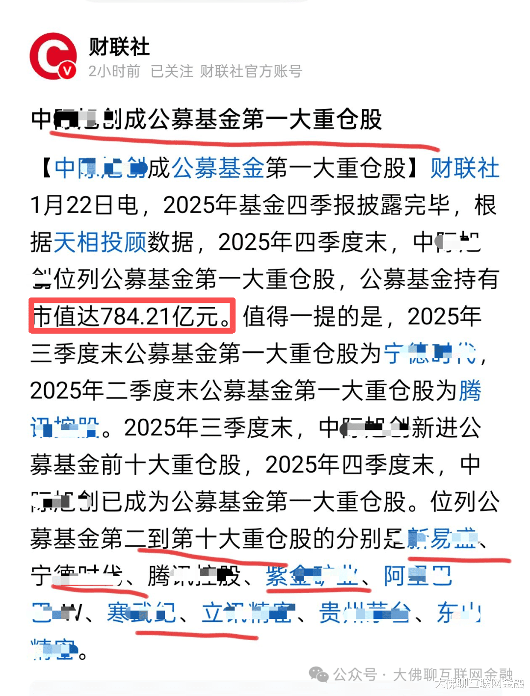 2025年公募基金四季度报已披露完毕,“易中天”三杰里的“中”成为公募第一大重仓股,合计持股市值超784亿元。