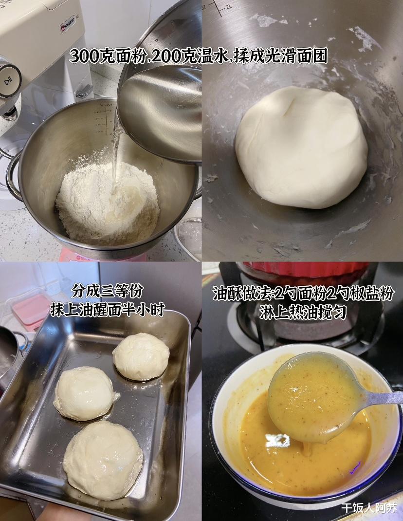 在面团醒发的间隙,我们来准备灵魂所在的油酥。取一个小碗,放入两勺面粉和两勺椒盐粉,搅拌均匀后,淋上烧得滚烫的热油,迅速搅动,一碗香气扑鼻的油酥就完成了。油酥是形成千层结构的关键,它能在面皮之间形成隔离,烙制时热气会将其撑开,形成一层又一层的薄如蝉翼的层次。