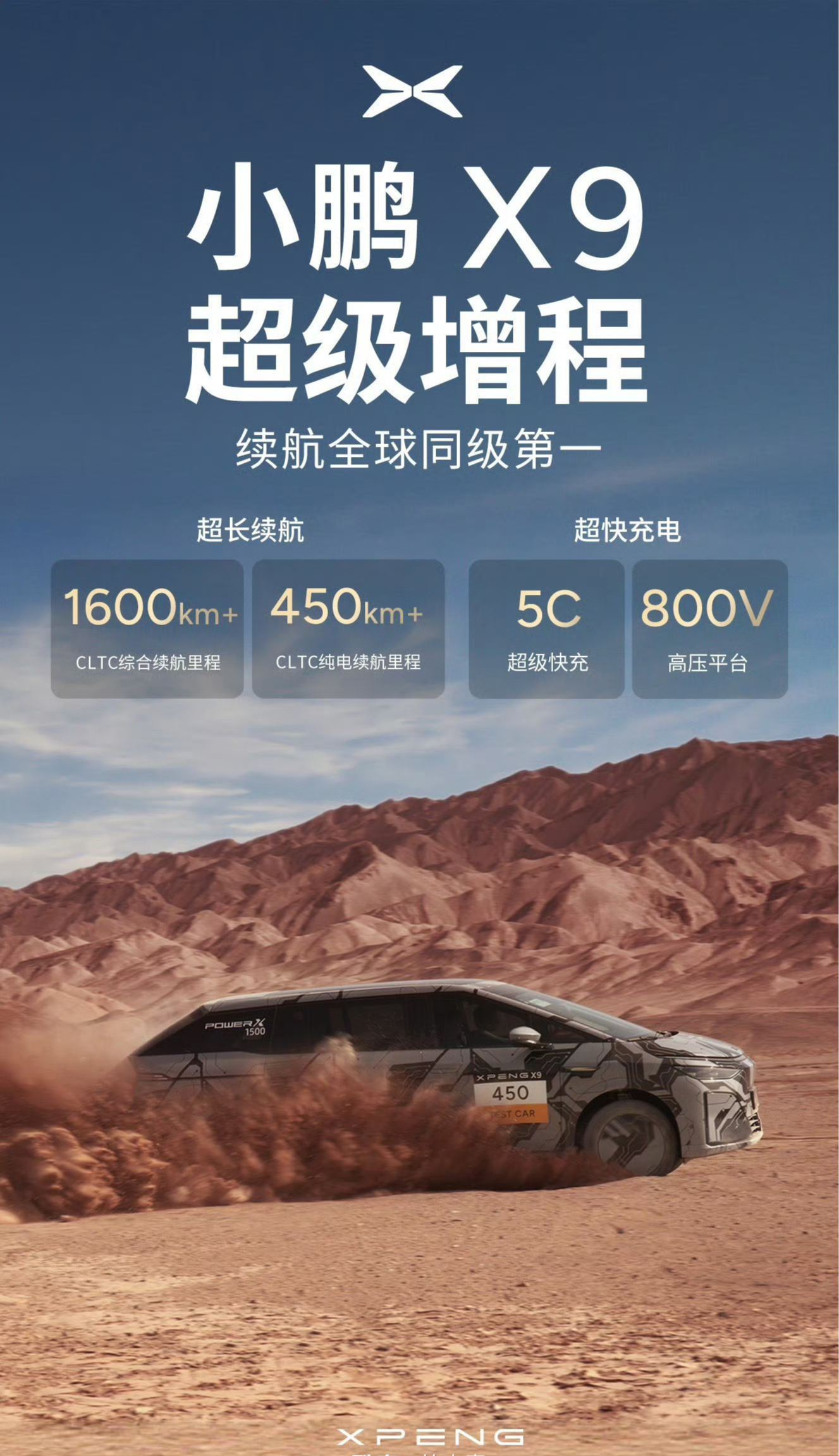 小鹏汽车于2025年9月9日正式宣布,其超级增程家族首款力作——小鹏X9超级增程版即将登场。这款车型凭借超过450公里的CLTC纯电续航和超过1600公里的CLTC综合续航,成功夺得全球同级车型续航第一的宝座。