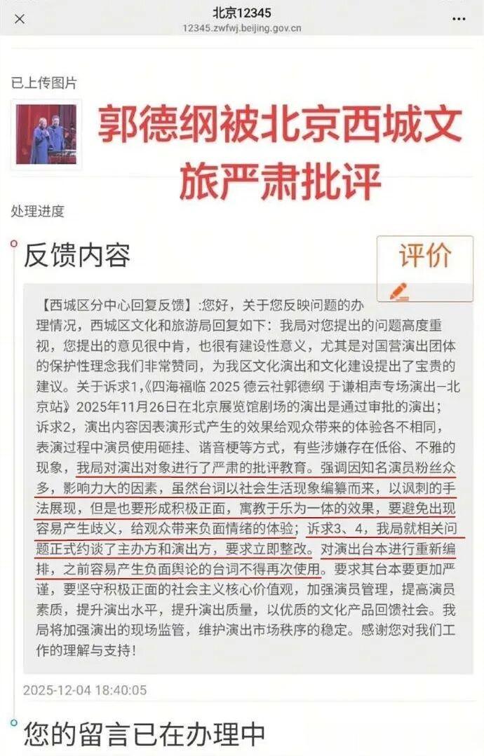 针对德云社的举报,是12月2日提交的,官方那个12月4日给予的回应。官方回馈后,相关截图就被晒出了。12月6日,在网络形成了关注。