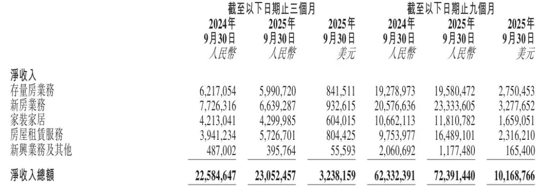 但透过最新财报可知,贝壳找房2025年前三季度的新房交易总额为1963亿元,同比减少13.7%。同时,新房业务的净收入也由2024年第三季度的77.26亿元减少14.1%至2025年同期的66.39亿元,基本盘明显遭遇增长瓶颈。