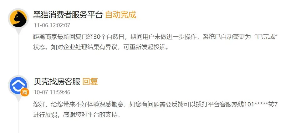 面对用户提出的各种现实问题,贝壳找房客服的回复话术却是千篇一律,即表达歉意并提醒用户通过平台客服热线反馈。而大部分状态为“已完成”投诉单,则是“商家回复过去30个自然日,用户未做进一步操作下”的系统自动变更。