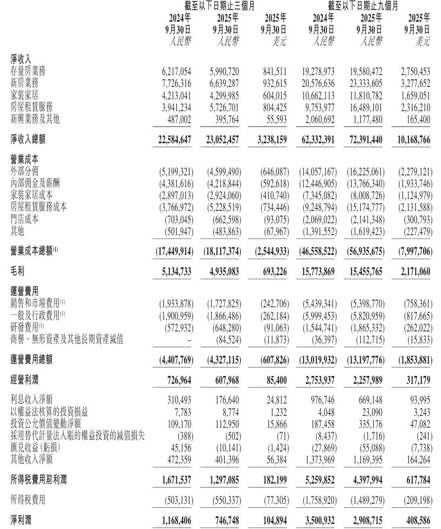 进入2025年后,贝壳找房的业绩困境进一步加剧,在三季度总交易额(GTV)达7367亿元的情况下,该公司的收入仅同比增长2.1%至230.52亿元;净利润依旧延续上年的减少态势,同比下滑36.1%至7.47亿元。