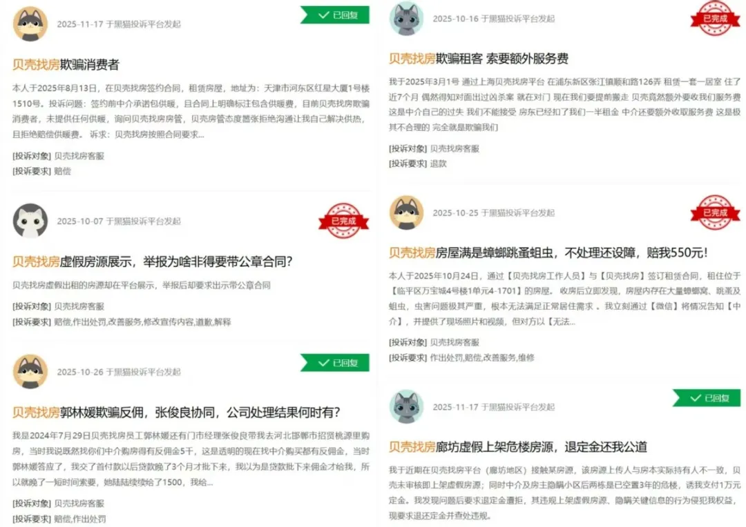 另据第三方投诉平台“黑猫投诉”的数据,目前平台上与关键词“贝壳找房”相关的投诉已超2600条,投诉问题涵盖售卖虚假房源、强制收取服务费、运用真假合同欺骗消费者、客服逃避推诿责任等。
