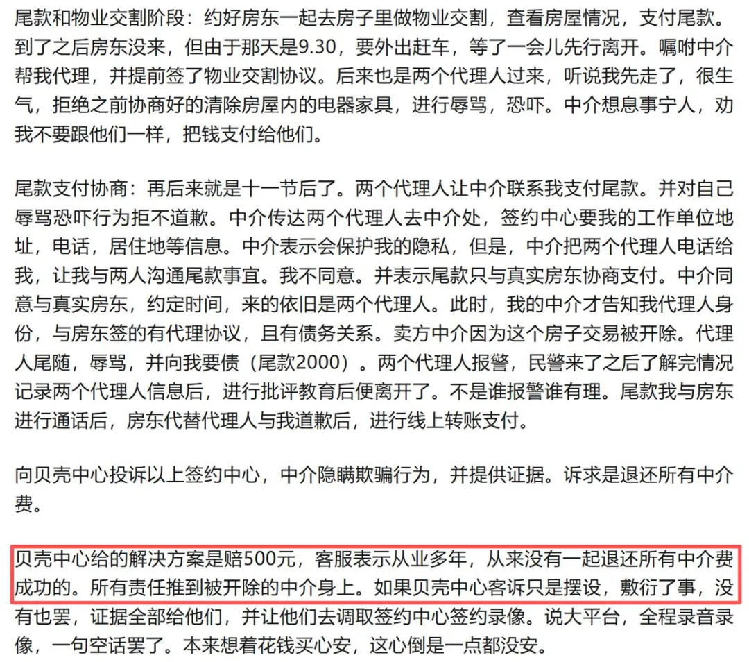 根据这名业主的说法,事发后自己向贝壳中心投诉了签约中心、中介的隐瞒欺骗行为。但对于他“退还所有中介费”的诉求,贝壳中心仅给出了赔偿500元的解决方案,客服更是直言从业多年,从来没有遇到过退还所有中介费的先例。