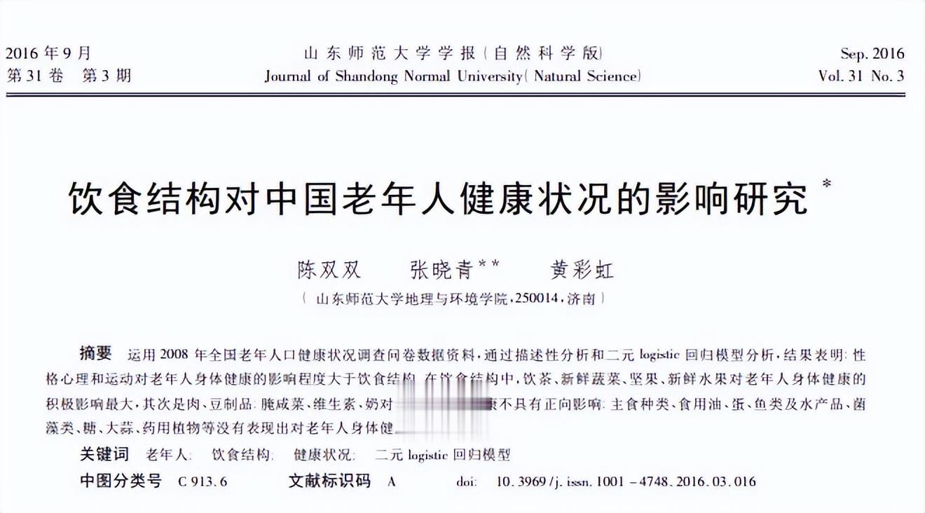 陈双双.饮食结构对中国老年人健康状况的影响研究, 山东师范大学学报(自然科学版), 2016-09-15.